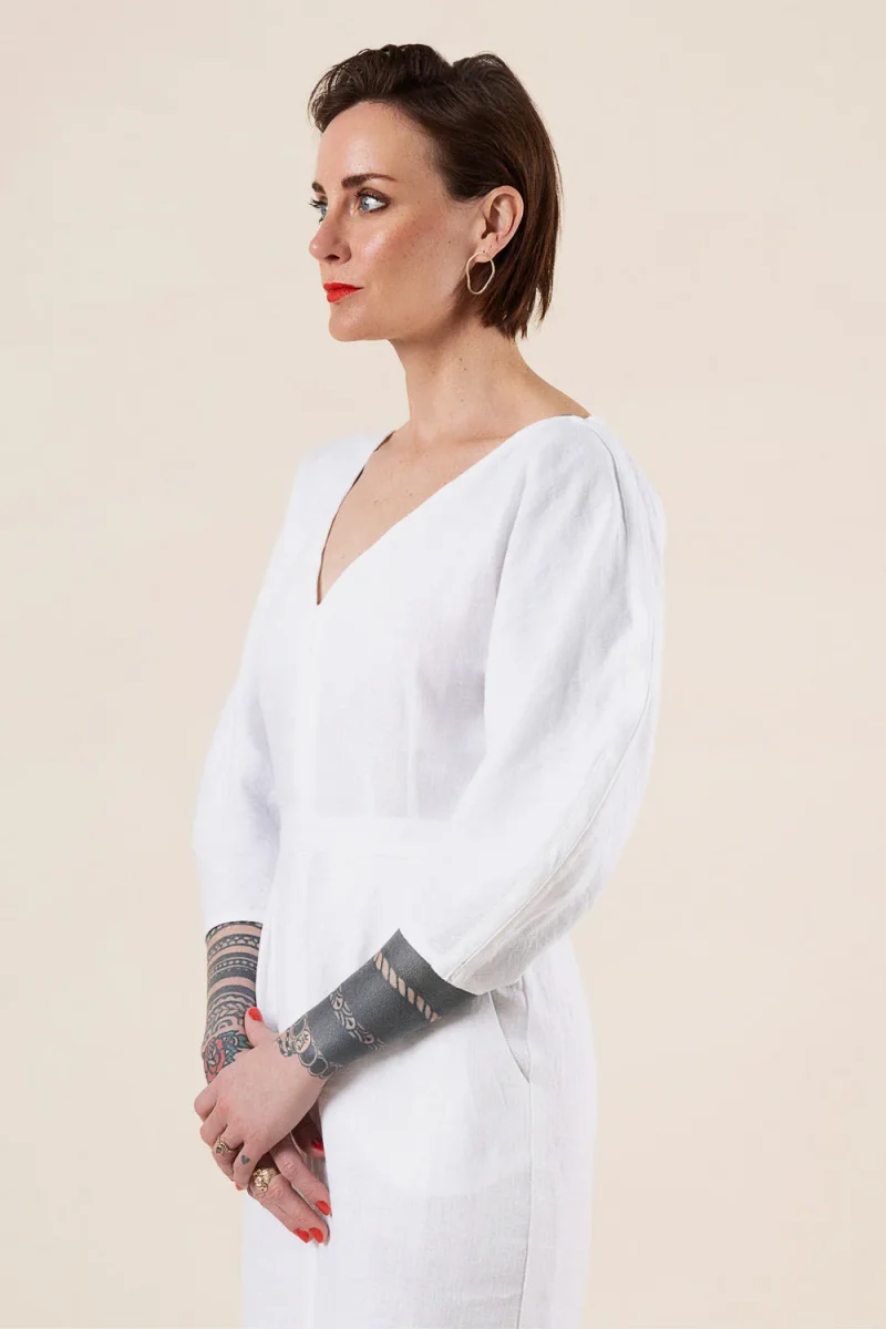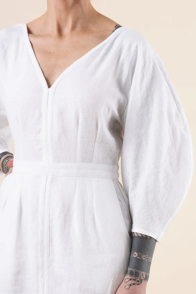 Make a true statement with the Jo Dress + Jumpsuit. A V-necked bodice with a sculptural “croissant” sleeve is the star of the show and can be mixed and matched with your choice of pants or skirt to create a bold dress or jumpsuit. Featuring a beautiful and innovative bias-bound slot seam finish to add structure and dimension, Jo is an engaging sew with a big impact.