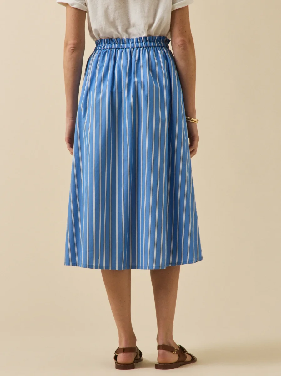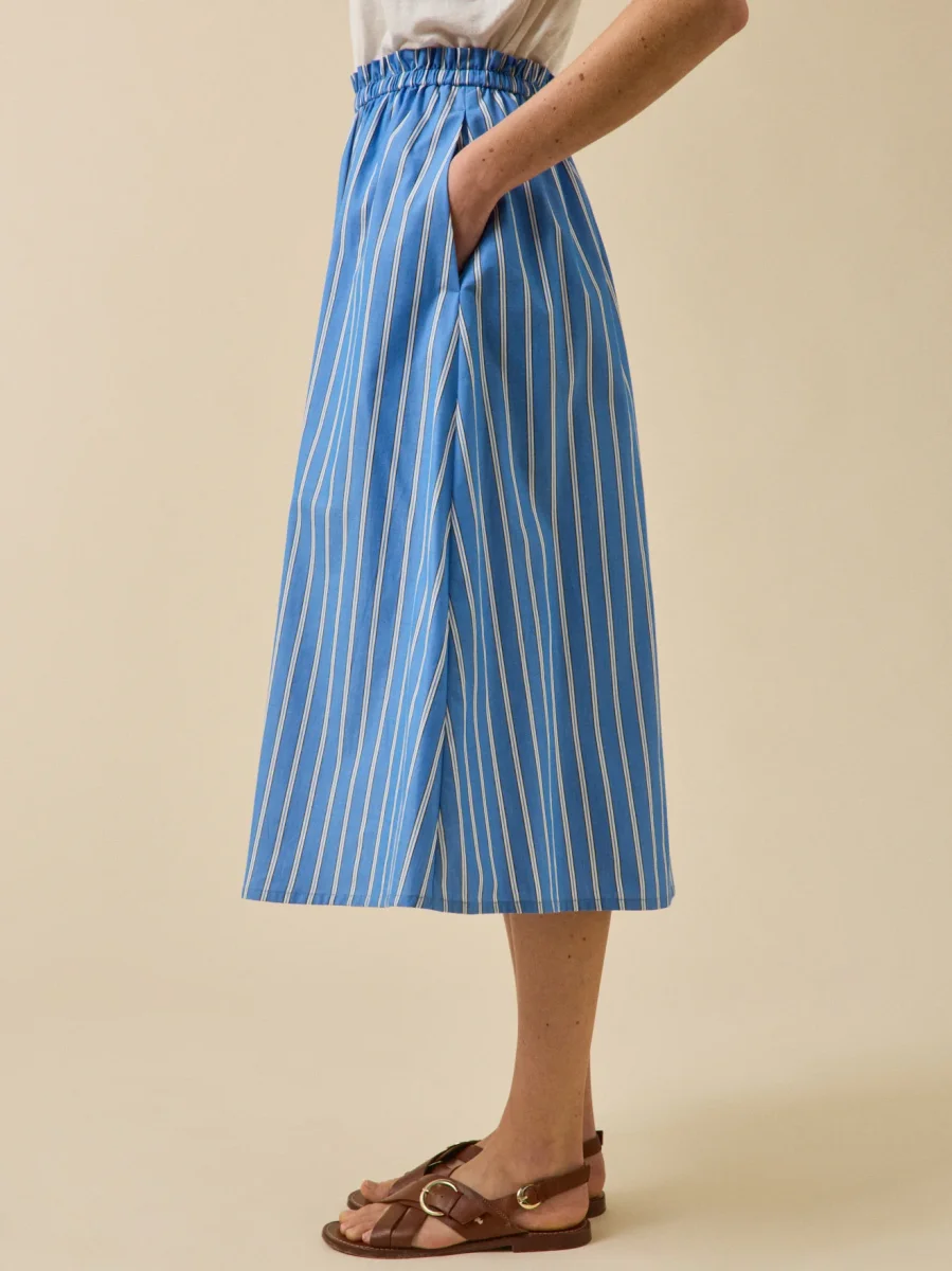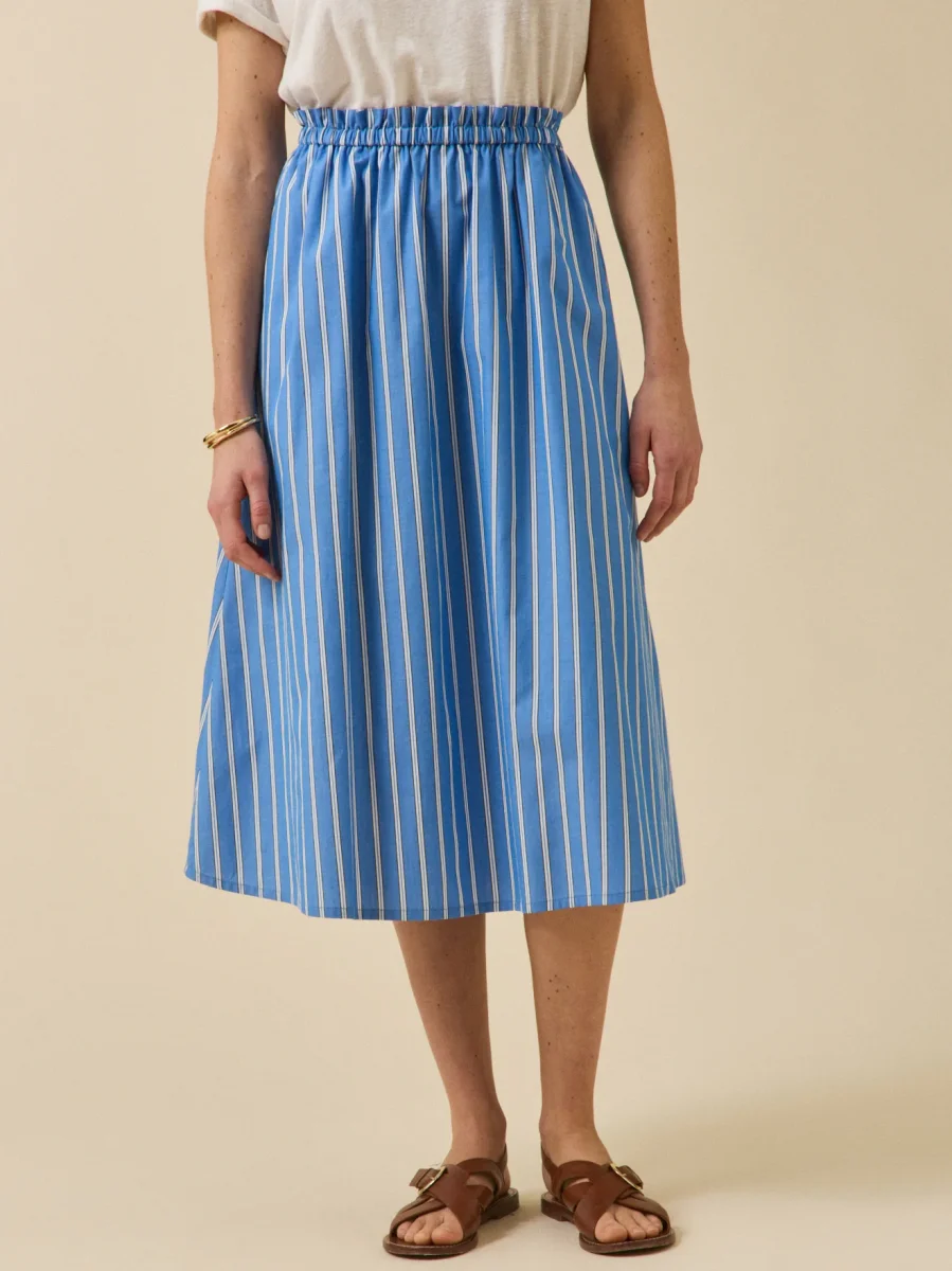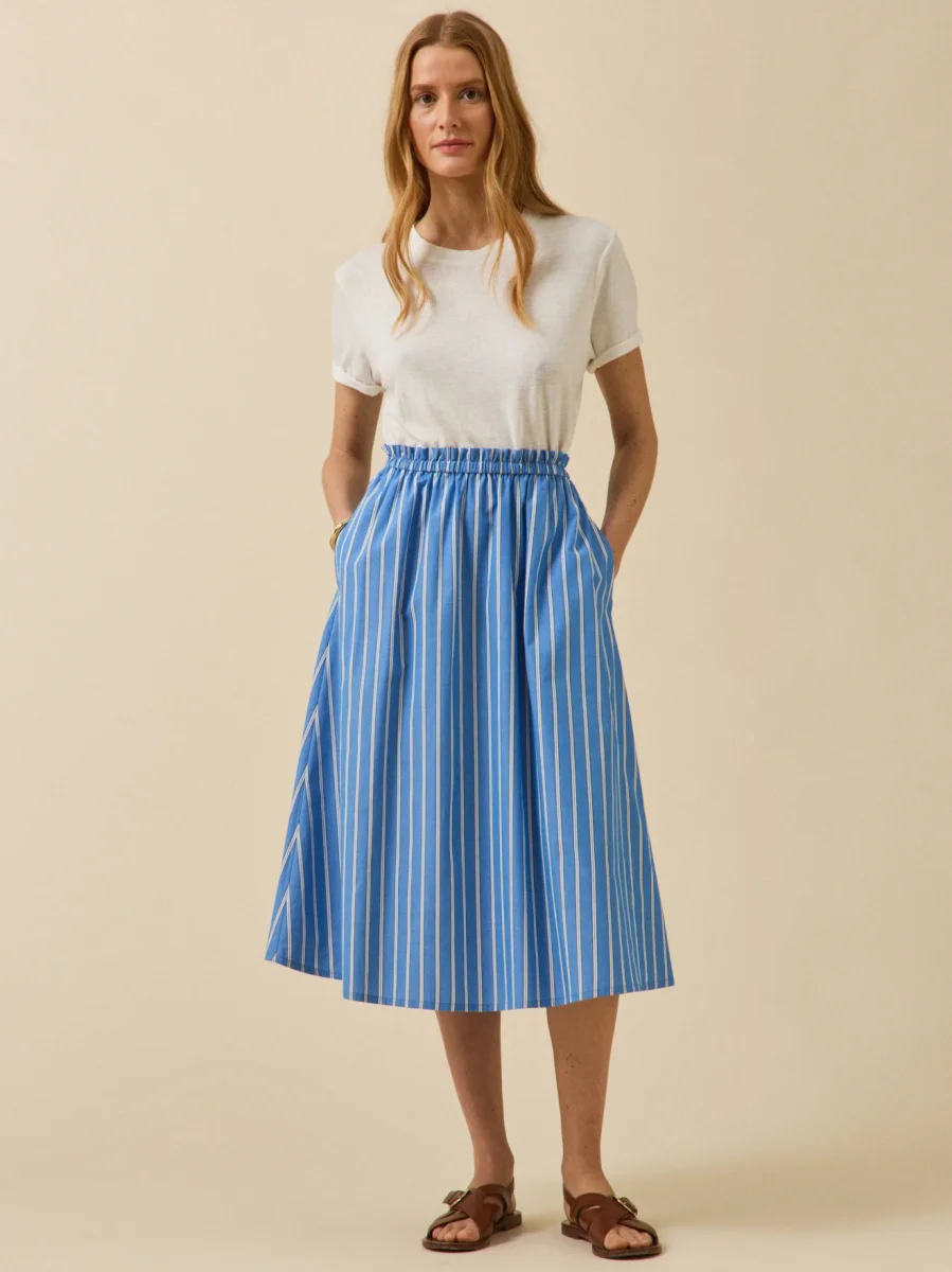 Épure et savoir-faire : notre rayure signature se dessine dans un tissé-teint d’une finesse absolue. Sur une jupe longue à l’allure évidente, facile à vivre au quotidien.
