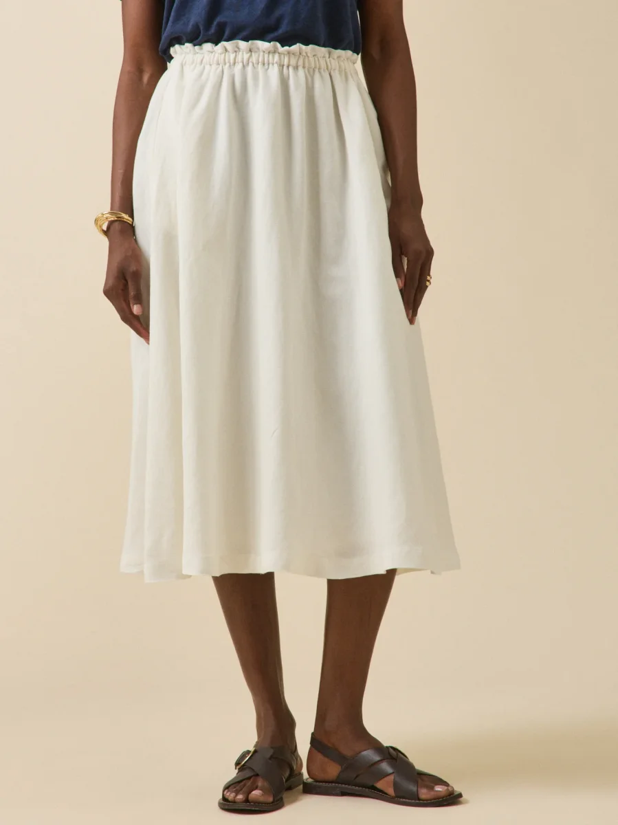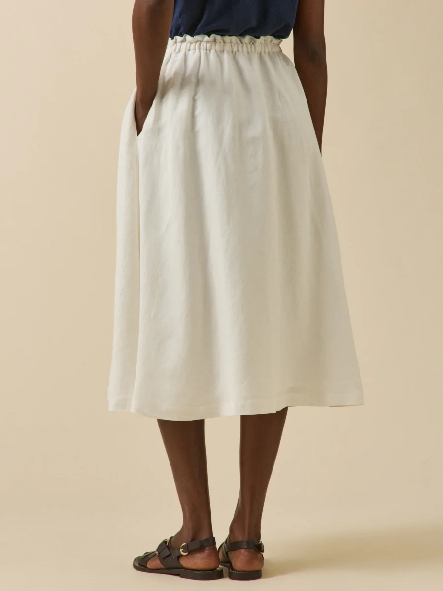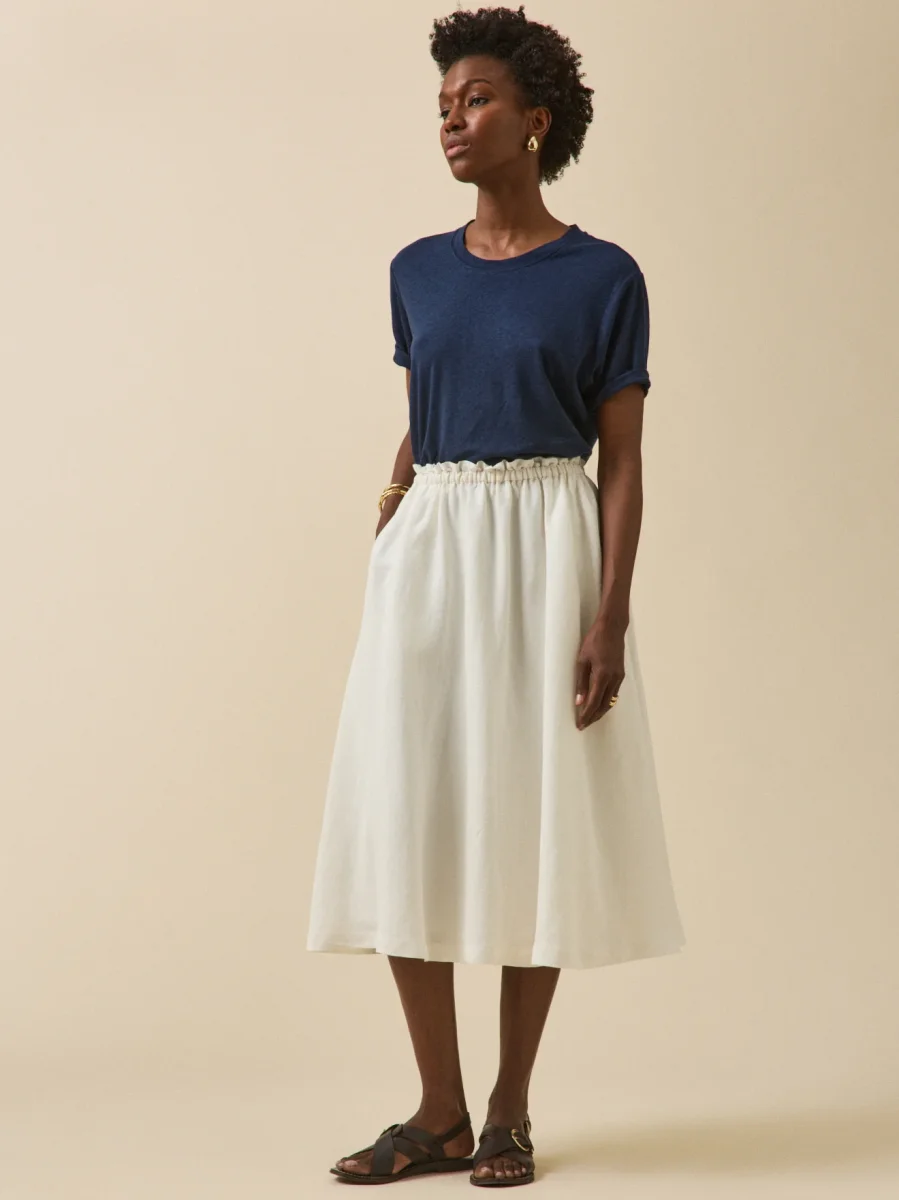 Avec sa belle matière mélangée, elle s’offre le look du lin, mais en version plus fluide, plus féminine. Avec sa ligne longue et évasée, la jupe assure une allure estivale impeccable.