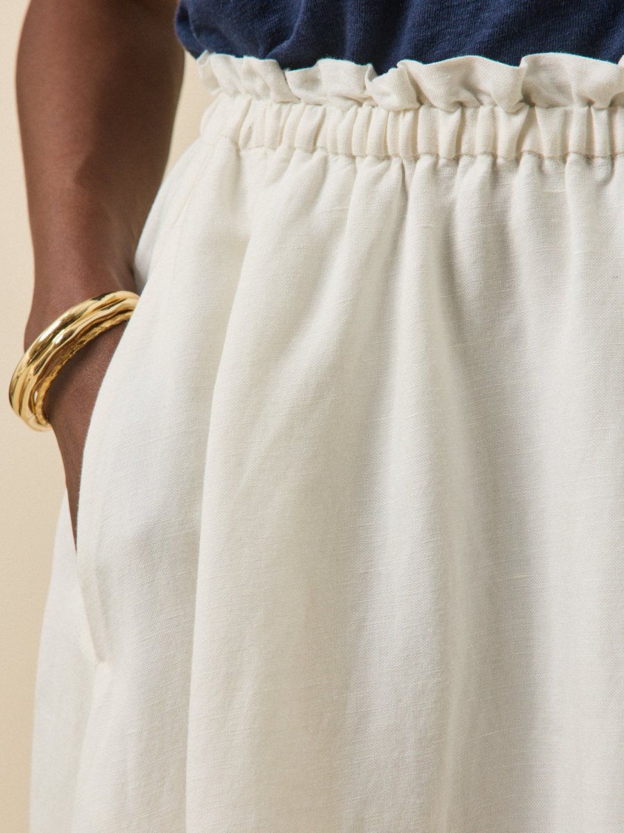 - Finition volantée sur ceinture élastiquée, fronces sous ceinture