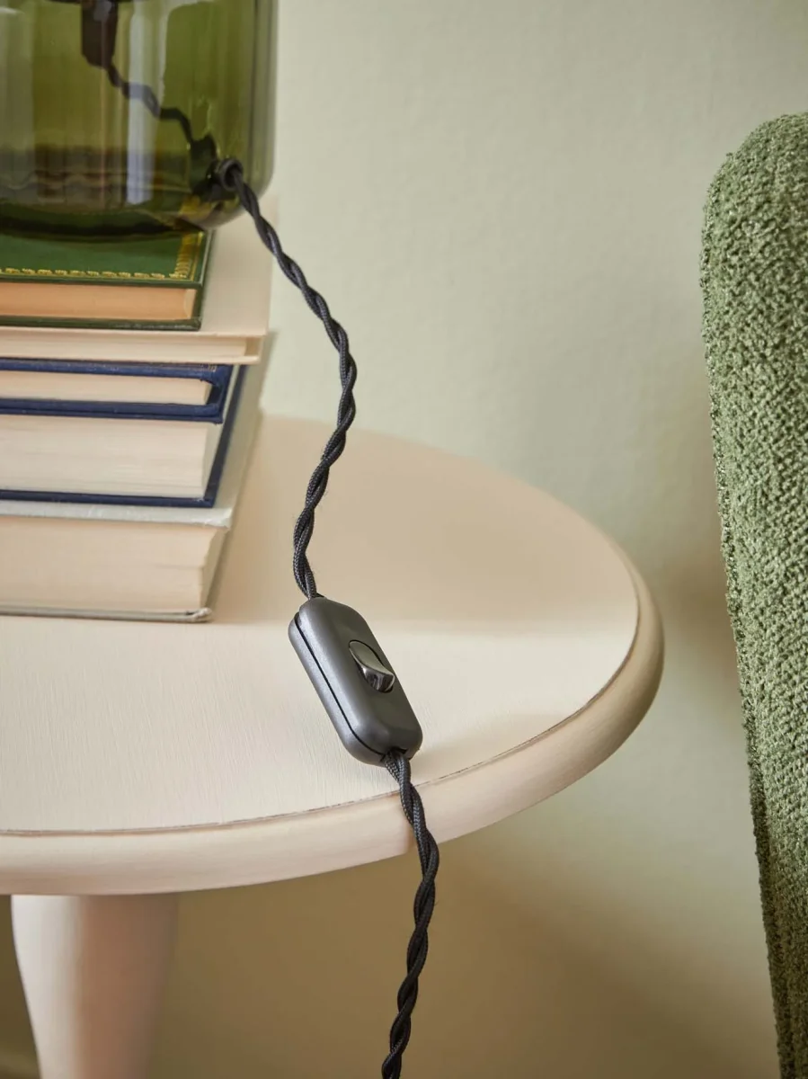 Câble noir torsadé 2 mètres, interrupteur noir. Ampoule non fournie (type culot à vis, LED E27 – 8W max.)