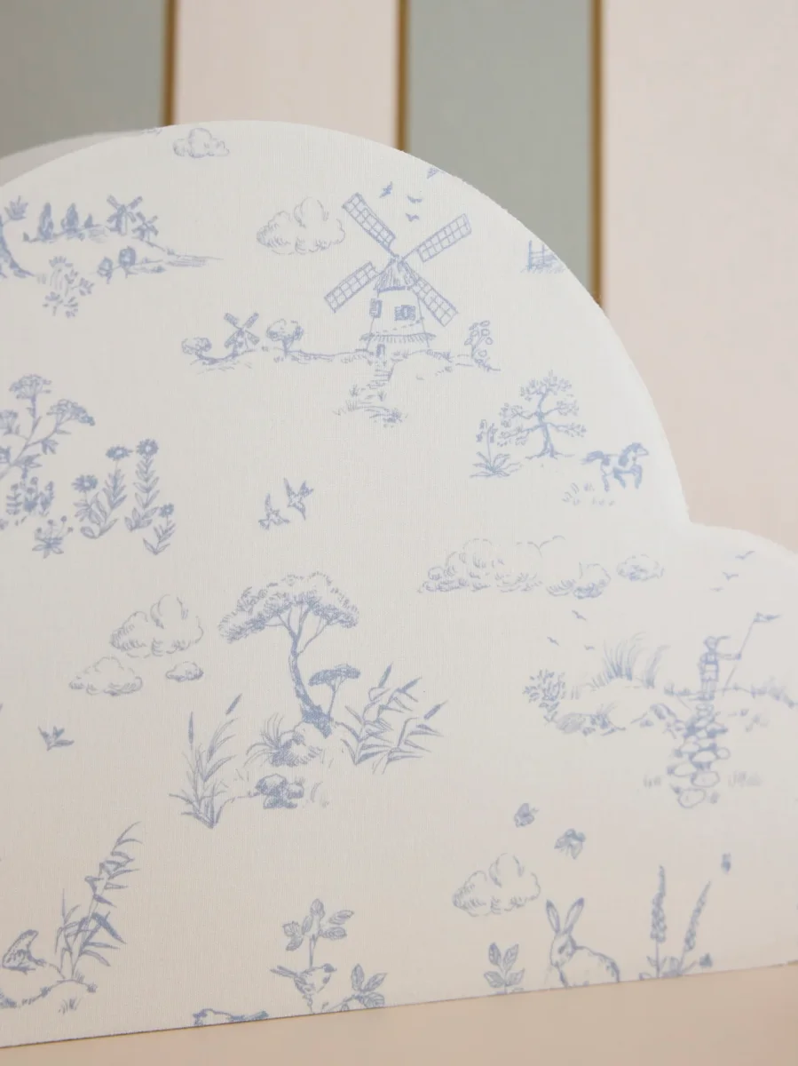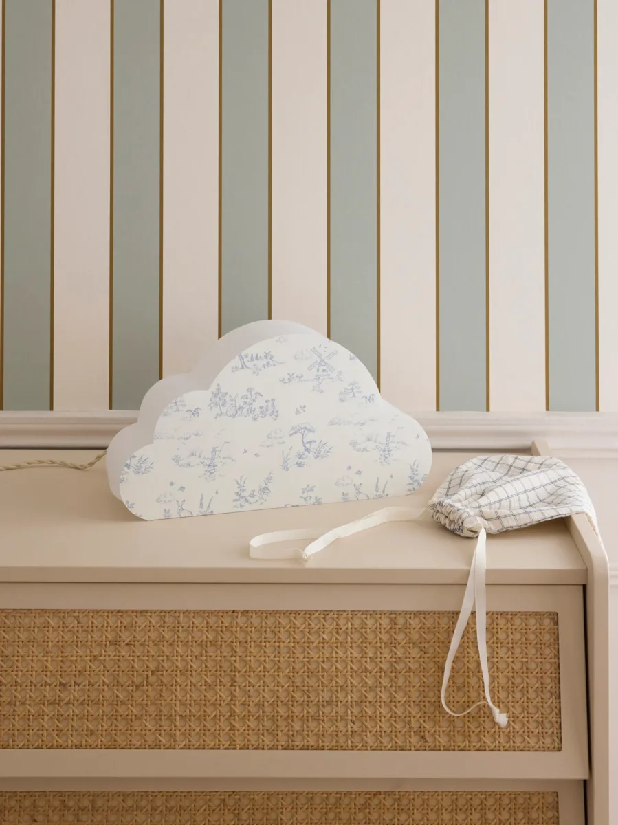 Lampe en forme de nuage pour une ambiance douce et apaisante. Son motif, réalisé par nos stylistes, est inspiré de la célèbre toile de Jouy. Lampe en tissu fabriquée en France. Se fixe au mur ou se pose sur une commode.
