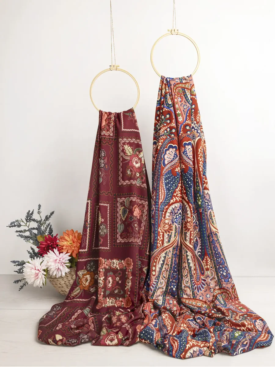 This Ecovero viscose print features a striking large-scale floral and paisley composition with unmistakable boho folk character. Rich red tones take the lead, beautifully accented with sprinkles of blue and soft cream for depth and contrast. Woven from 100% Ecovero viscose, this fabric has a liquid, fluid drape that falls effortlessly and moves with graceful flow. The hand is butter-soft and smooth, cool to the touch in the way viscose is known for, while remaining fully opaque. Play with the scale and positioning of the motif to create truly spectacular statement pieces—flowy dresses, romantic blouses, and dramatic palazzo pants that let the artwork shine.