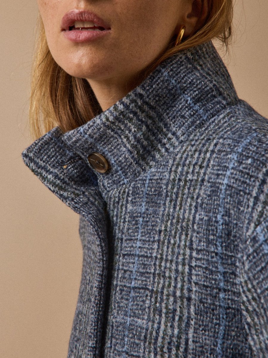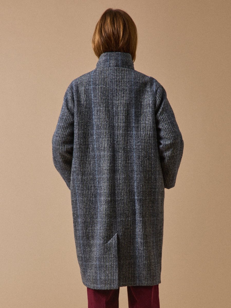 Manteau col montant drap de laine carreaux femme