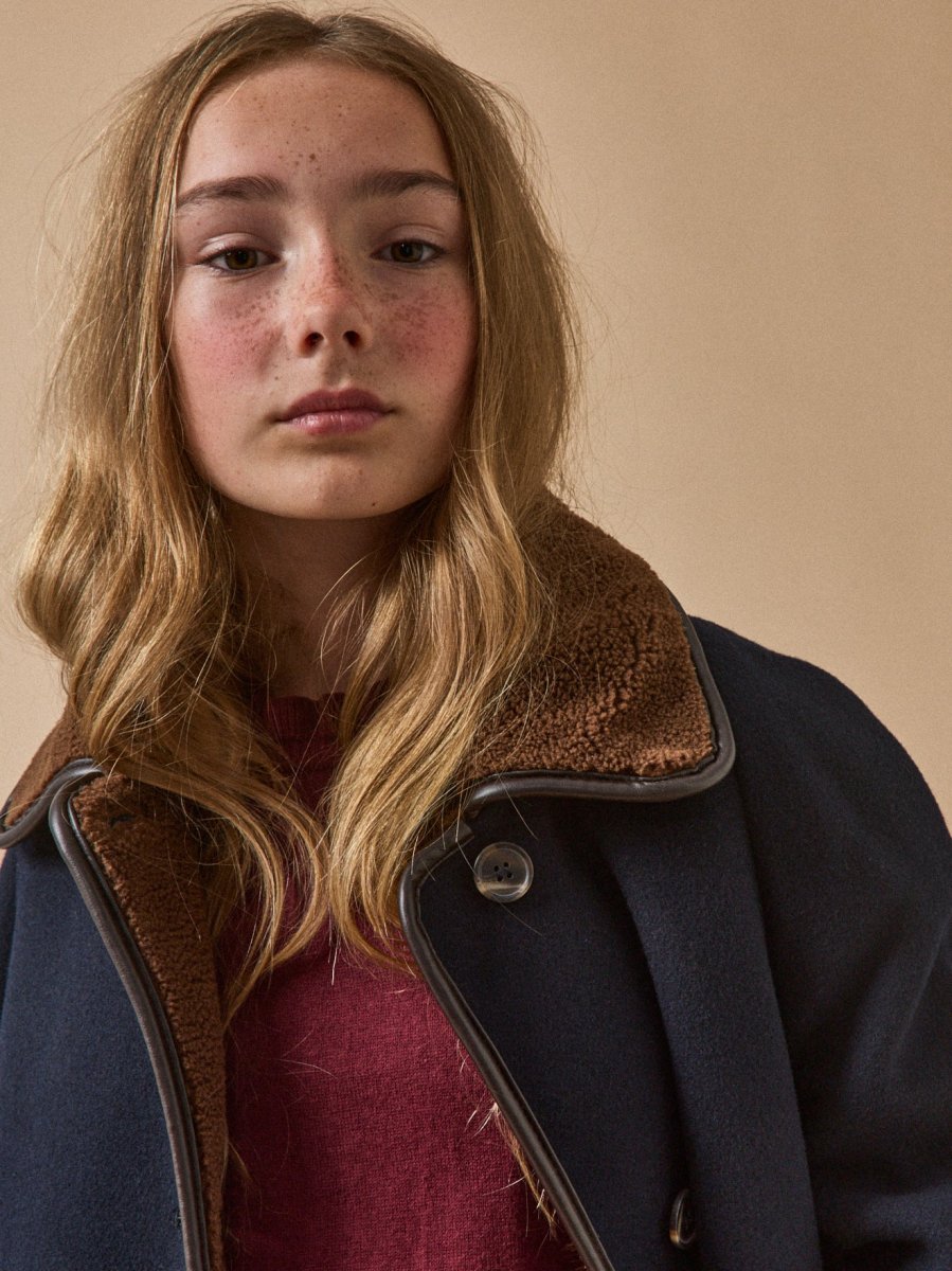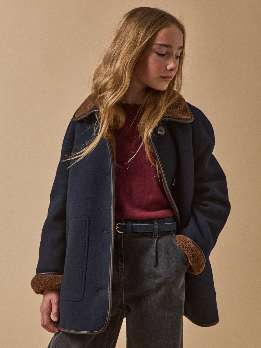 Manteau à la ligne sobre et à la finition raffinée. Composé à 50% de laine et doublé de sherpa contrasté. Le biais marron imitation cuir souligne l’allure impeccable. Look matchy-matchy mère/fille, ce manteau est également disponible en modèle adulte !