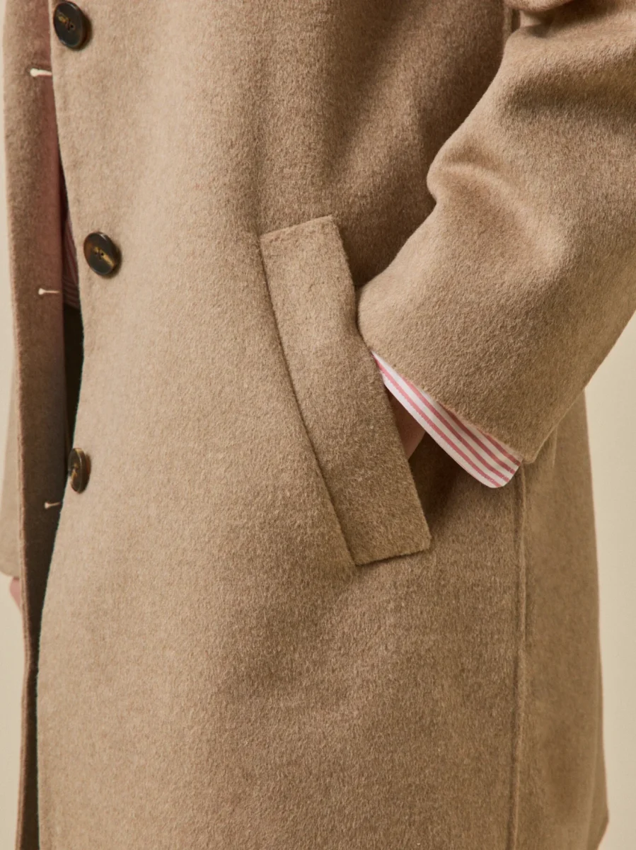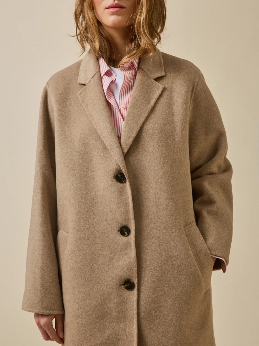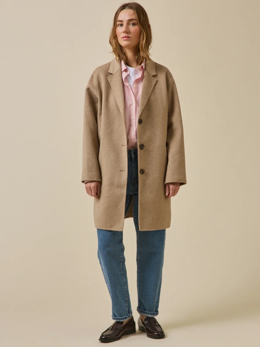 Ligne courte et épurée sur lainage double face chic et léger. Tout en souplesse, le manteau se plie aux exigences d’un style urbain contemporain. Et signe un look féminin tendance, parfait pour la mi-saison.