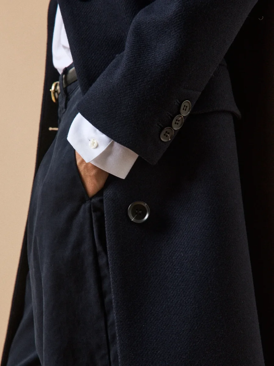 Hérité du vestiaire masculin, le manteau allie à la fois élégance féminine et inspiration pardessus. Celui-ci offre une construction épurée, droite et longue, dans un très beau lainage armuré de la maison italienne Manteco. Un style parfait pour un look urbain chic et durable.