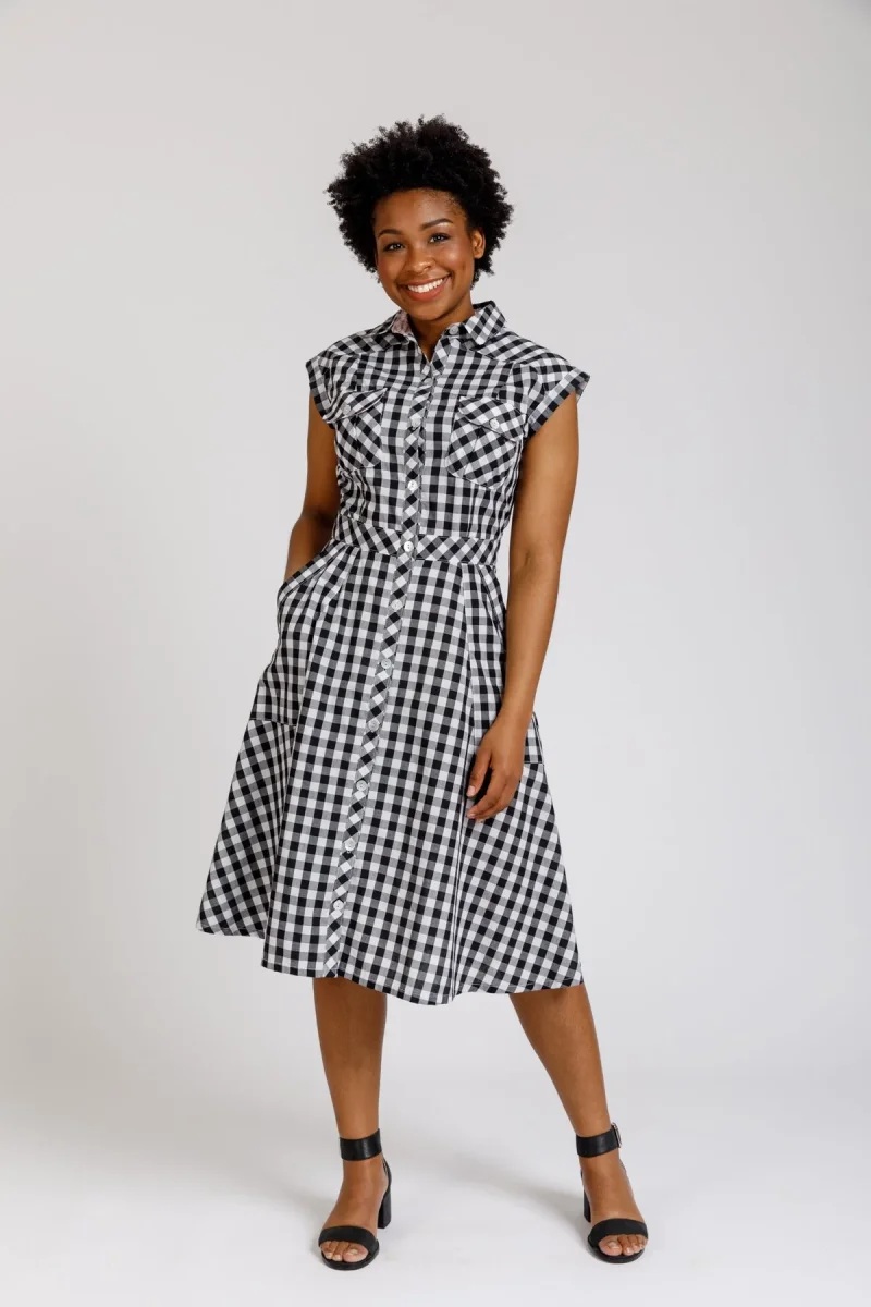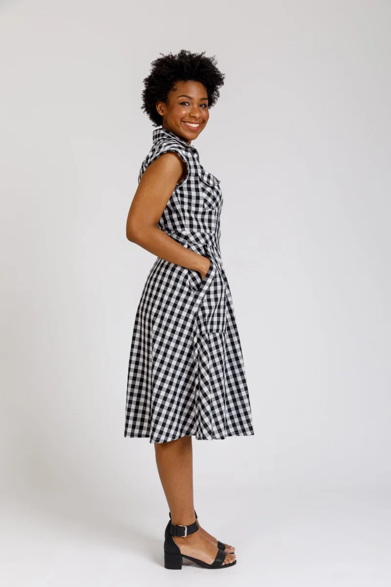 Matilda is a modern utility style shirt dress. Pattern features princess seams, drop shoulder or sleeves, pleated breast pockets, an A-line skirt with roomy statement pockets and collar and stand.