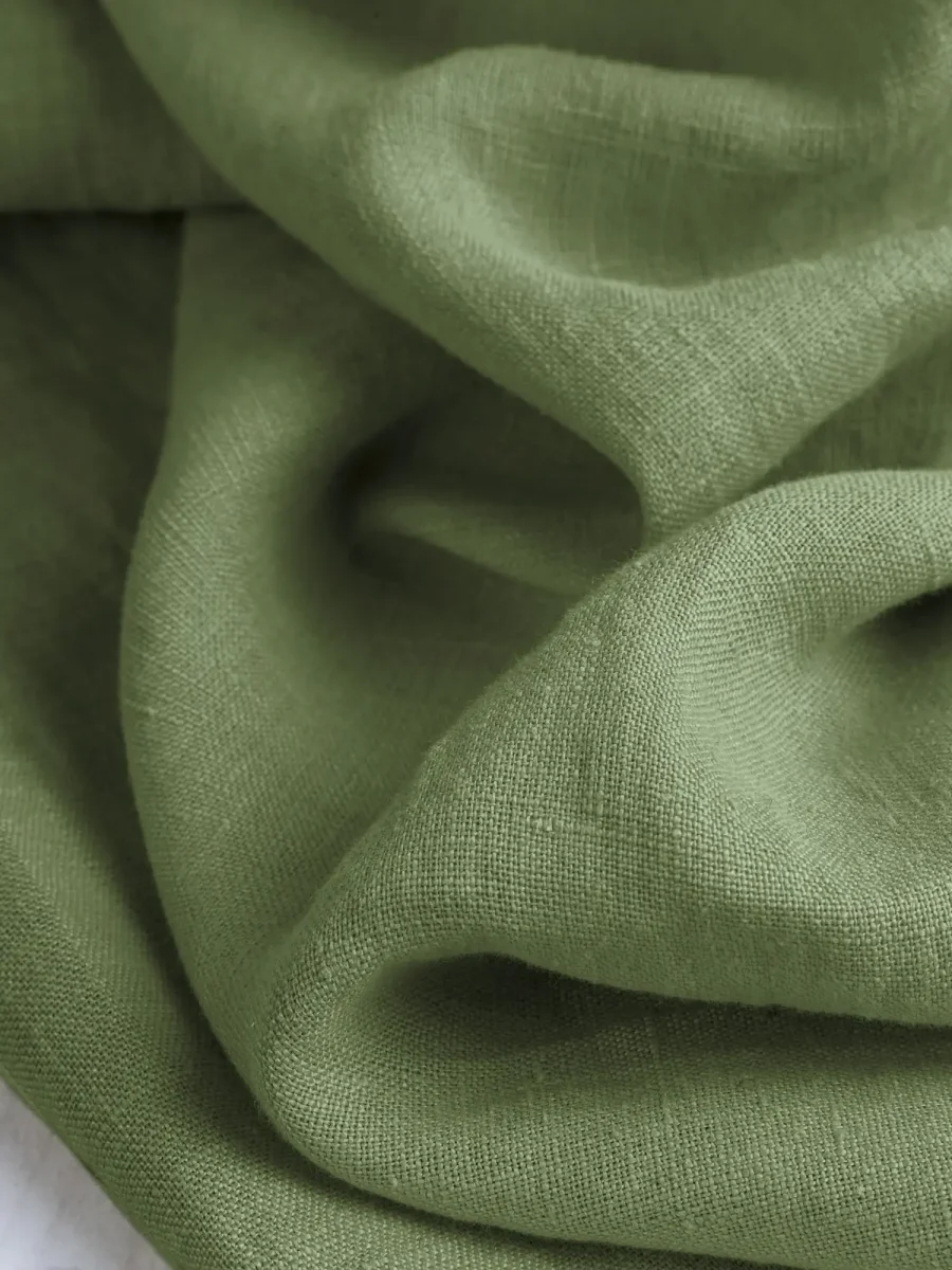Midweight European flax linen, basil green colour, fully opaque—ideal for dresses, shirts, trousers, jumpsuits & light jackets.
