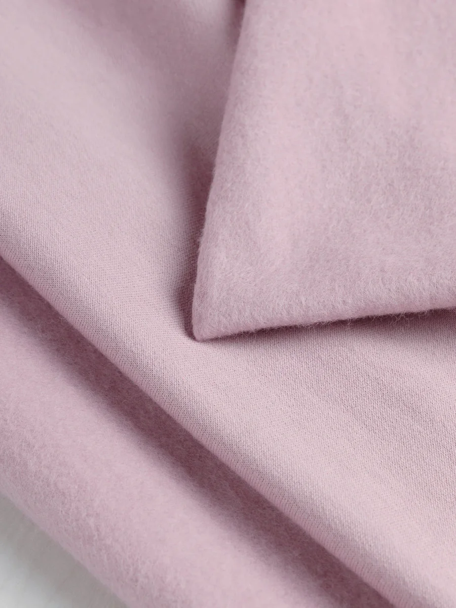 We’re proud to carry this locally produced, exceptionally high quality cotton fleece. Not only is it the coziest fleece we’ve ever fondled, but it’s made right here in Montreal, Canada out of certified organic cotton! Not bad, eh? This gorgeous non-stretch fabric features a smooth knit weave on one side and an ultra-soft fleece hand on the other, resulting in ultimate comfort and warmth. Heavyweight with a moderate drape, with a tiny amount of mechanical stretch on the crossgrain, it’s perfect for joggers and sweatshirts, in addition to loungewear like cardigans. Fully opaque, no lining is needed for this fabric.
