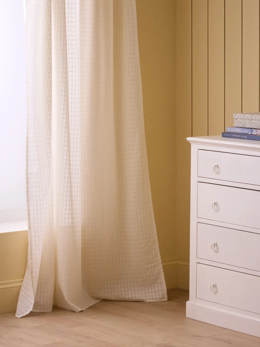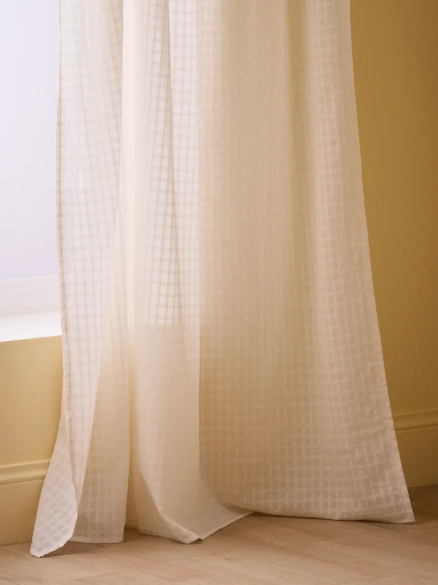 Il s’habille d’un jeu de carreaux texturés ton sur ton, créant un relief d’une élégance subtile. Le panneau en voile dobby offre une esthétique épurée qui préserve votre intimité tout en laissant une lumière douce et naturelle baigner la pièce.