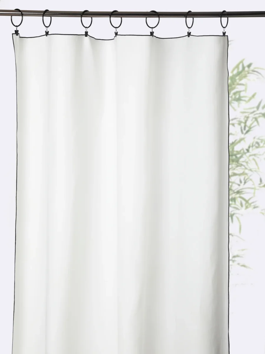 Finesse, modernité et simplicité d’un panneau en voile de coton en guise de rideau. Plus besoin d’ourlet : les anneaux à pince se positionnent selon la hauteur de voilage souhaitée. Fabrication Portugal.