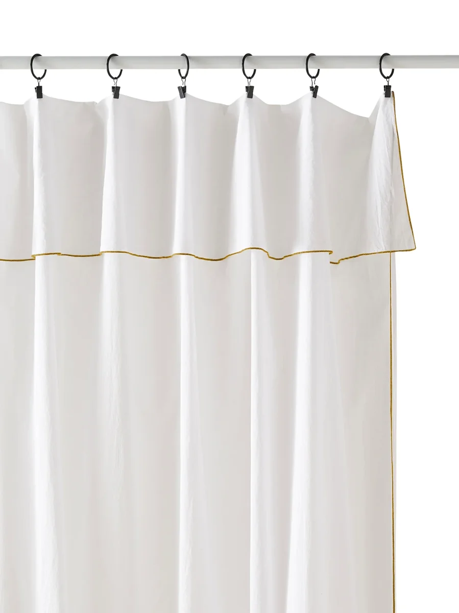 Finesse, modernité et simplicité d’un panneau en voile de coton en guise de rideau. Plus besoin d’ourlet : les anneaux à pince se positionnent selon la hauteur de voilage souhaitée. Fabrication Portugal.
