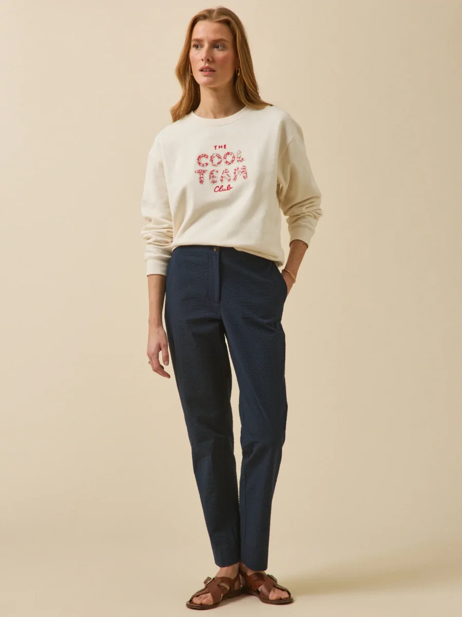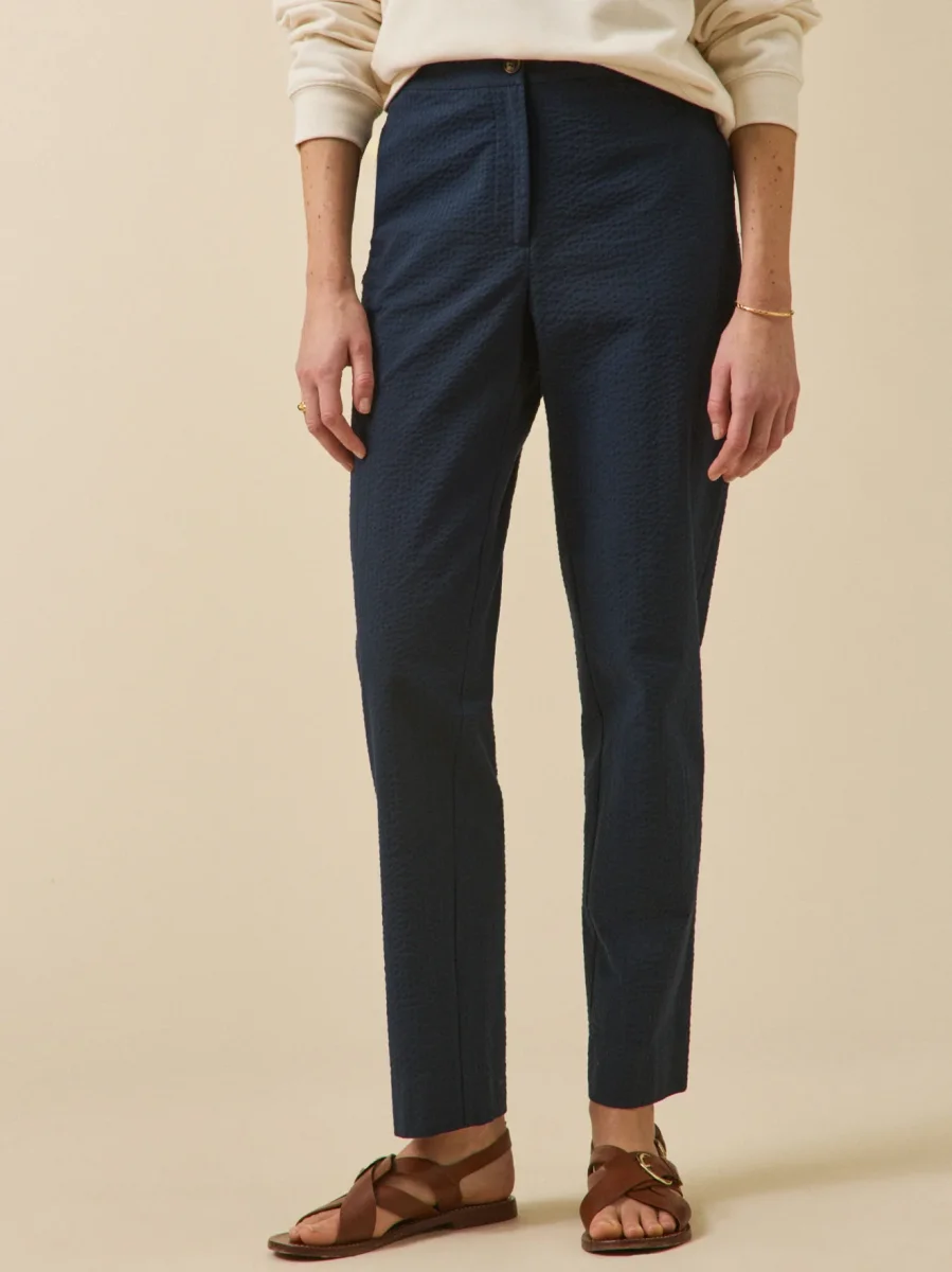 Sculpté dans un seersucker au relief gaufré emblématique, notre pantalon cigarette réinvente l’allure cool chic. Sa ceinture élastiquée au dos allie une aisance absolue à une silhouette impeccable, en faisant le complice idéal de votre vestiaire urbain.