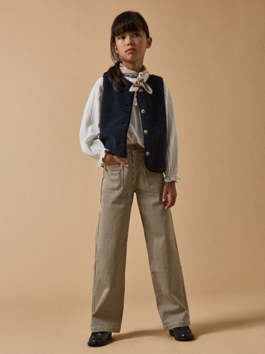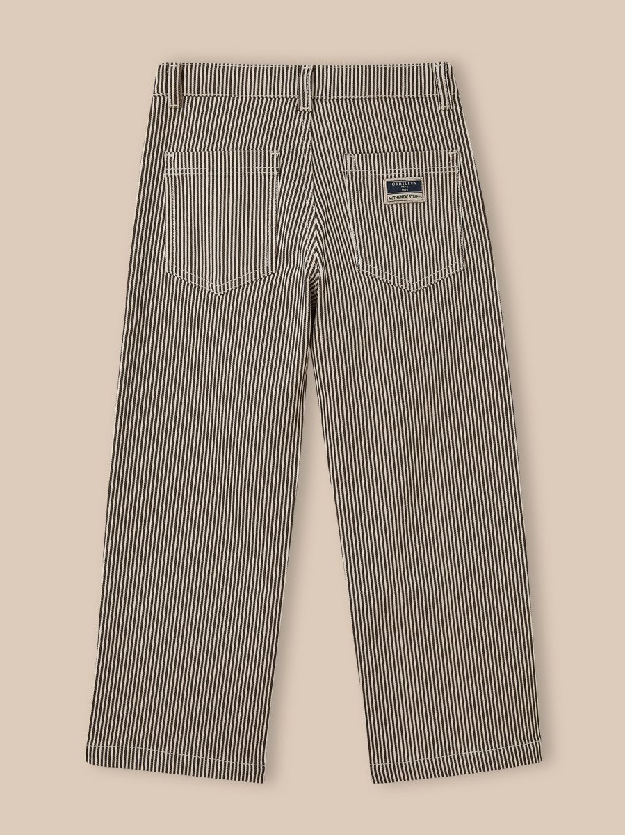Coupe droite légèrement élargie, taille haute et poches plaquées devant. Finement rayé, ce pantalon est parfait pour un look casual chic. Fermeture zippée et bouton 2 poches plaquées devant et au dos. Taille ajustable de l’intérieur par élastique boutonné