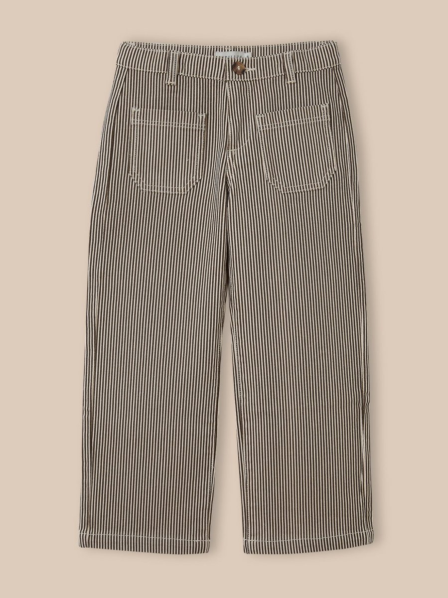 Coupe droite légèrement élargie, taille haute et poches plaquées devant. Finement rayé, ce pantalon est parfait pour un look casual chic.