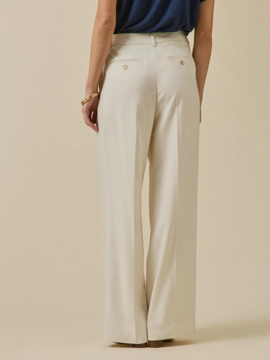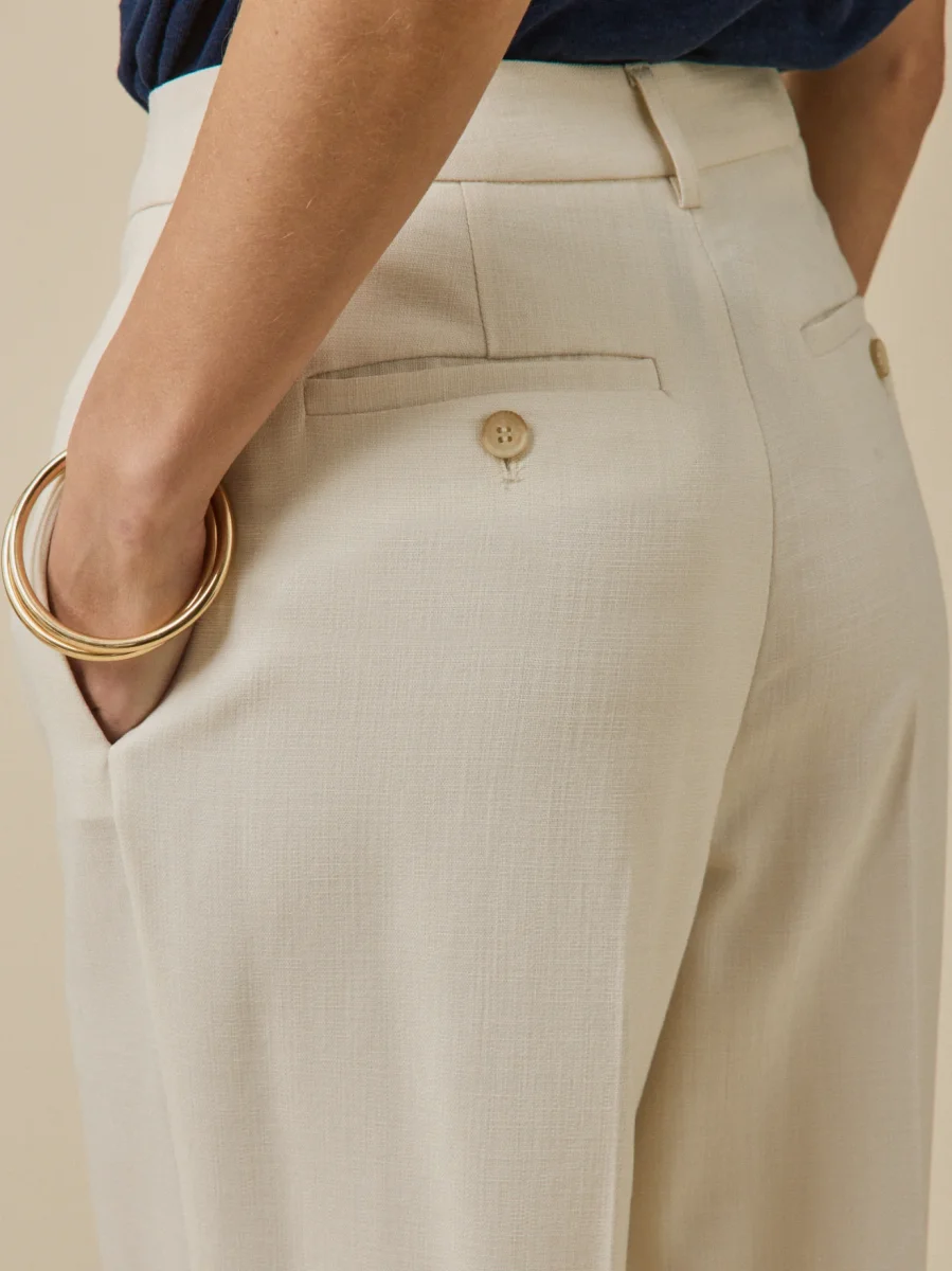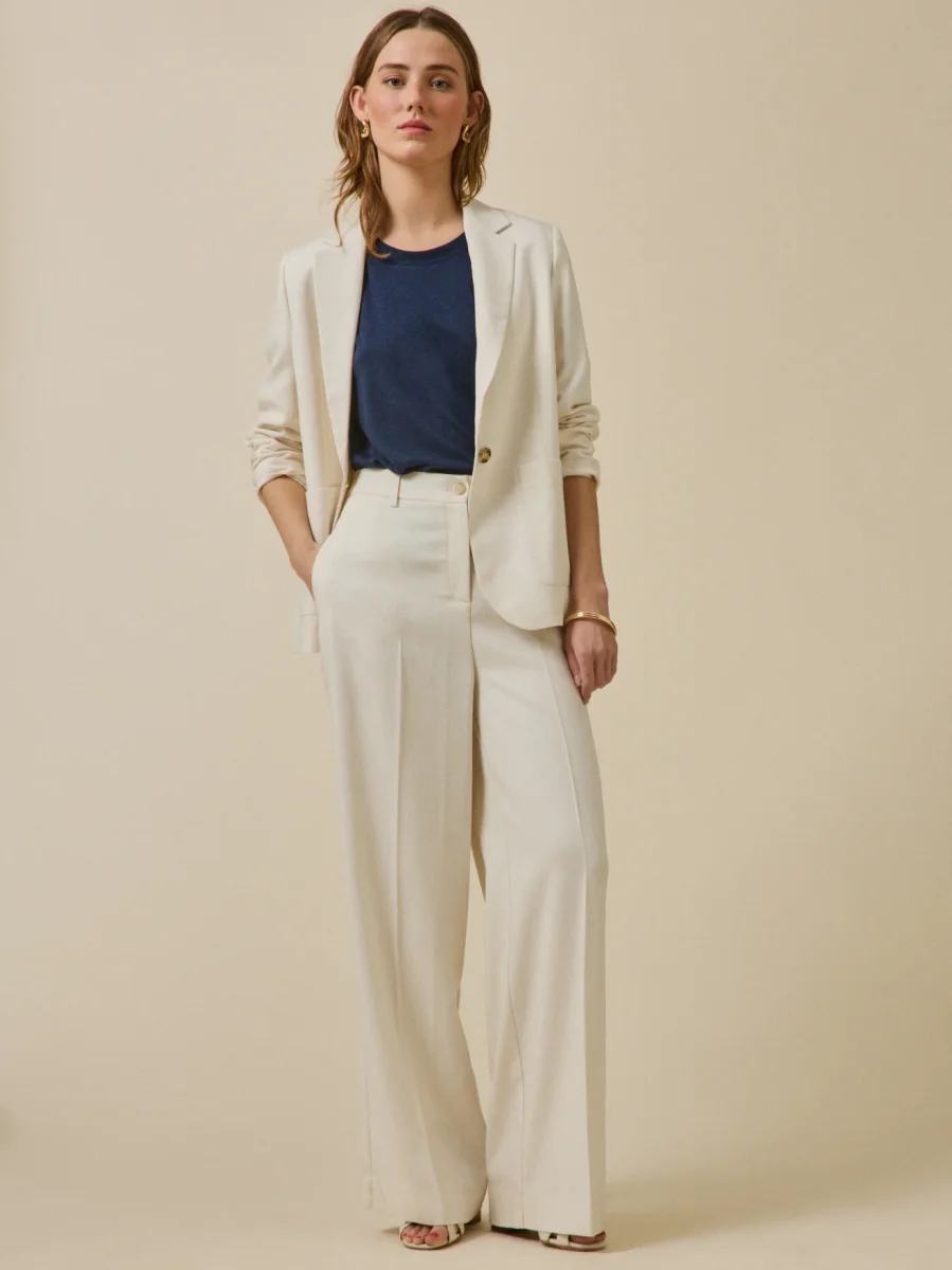 Un tissu natté portugais d’une qualité exceptionnelle. Ultra chic pour une cérémonie ou féminin au quotidien, le pantalon garde l’allure et conserve son charme, quelle que soit son interprétation. Confection Europe.