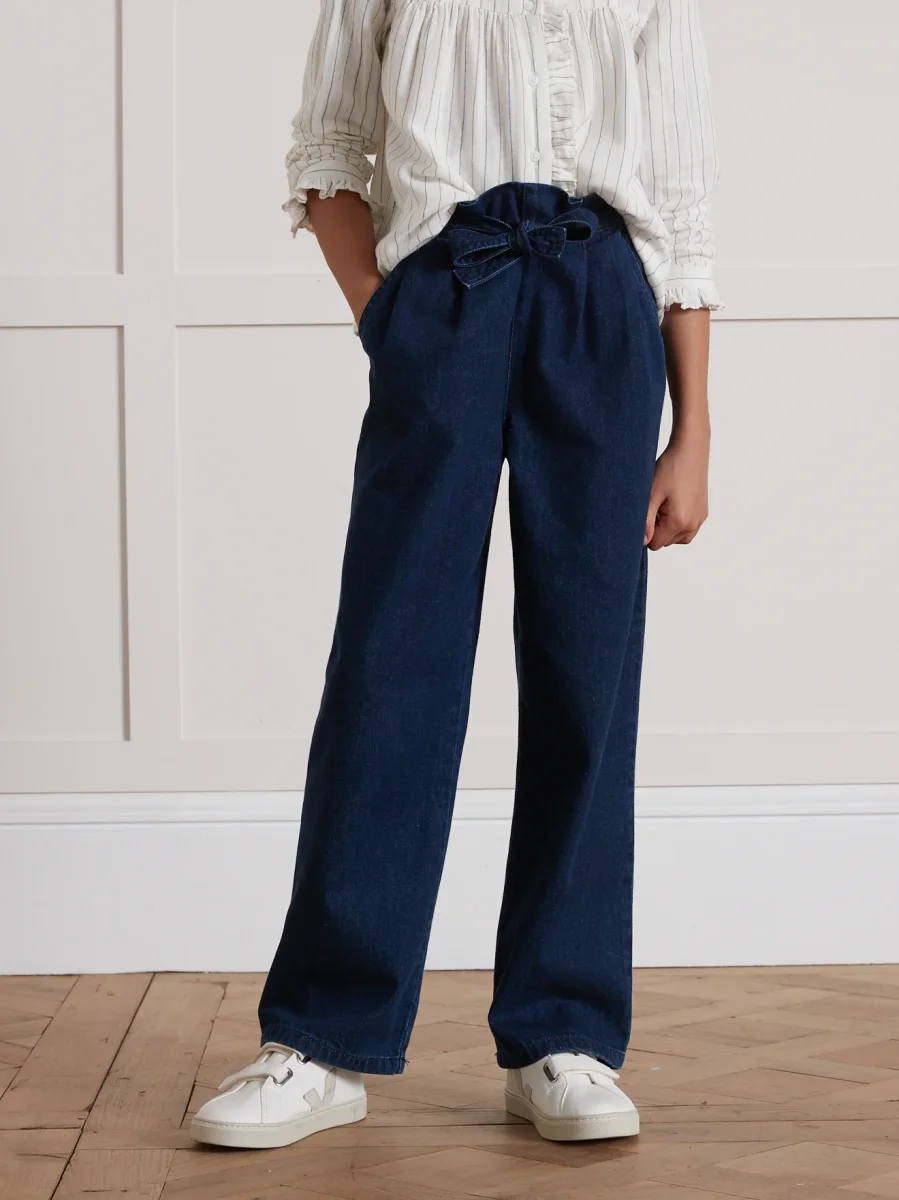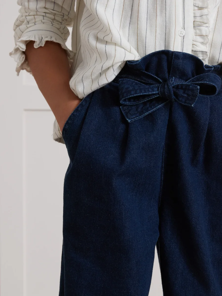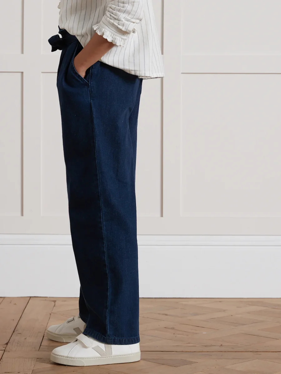 Coupe droite et large, denim souple et taille froncée : ce pantalon suit les mouvements et la tendance. Ceinture à nouer. Taille élastiquée dos. 2 poches côtés, 1 poche au dos.