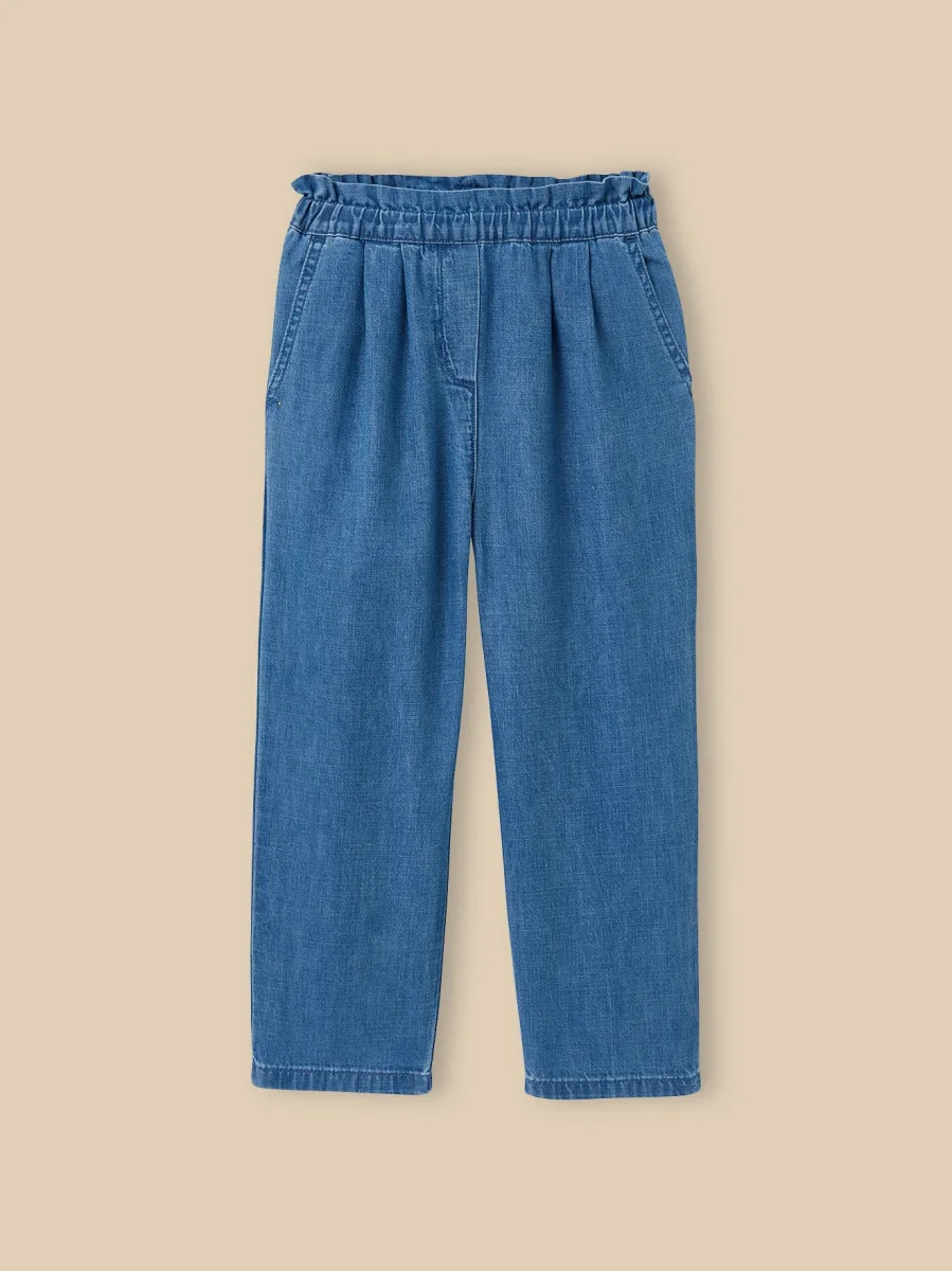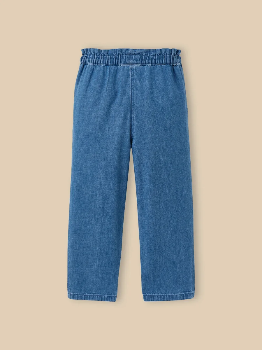 Coupe droite et large, denim souple et taille froncée : ce pantalon suit les mouvements et la tendance. Taille élastiquée dos. Fausse braguette. 2 poches côtés.