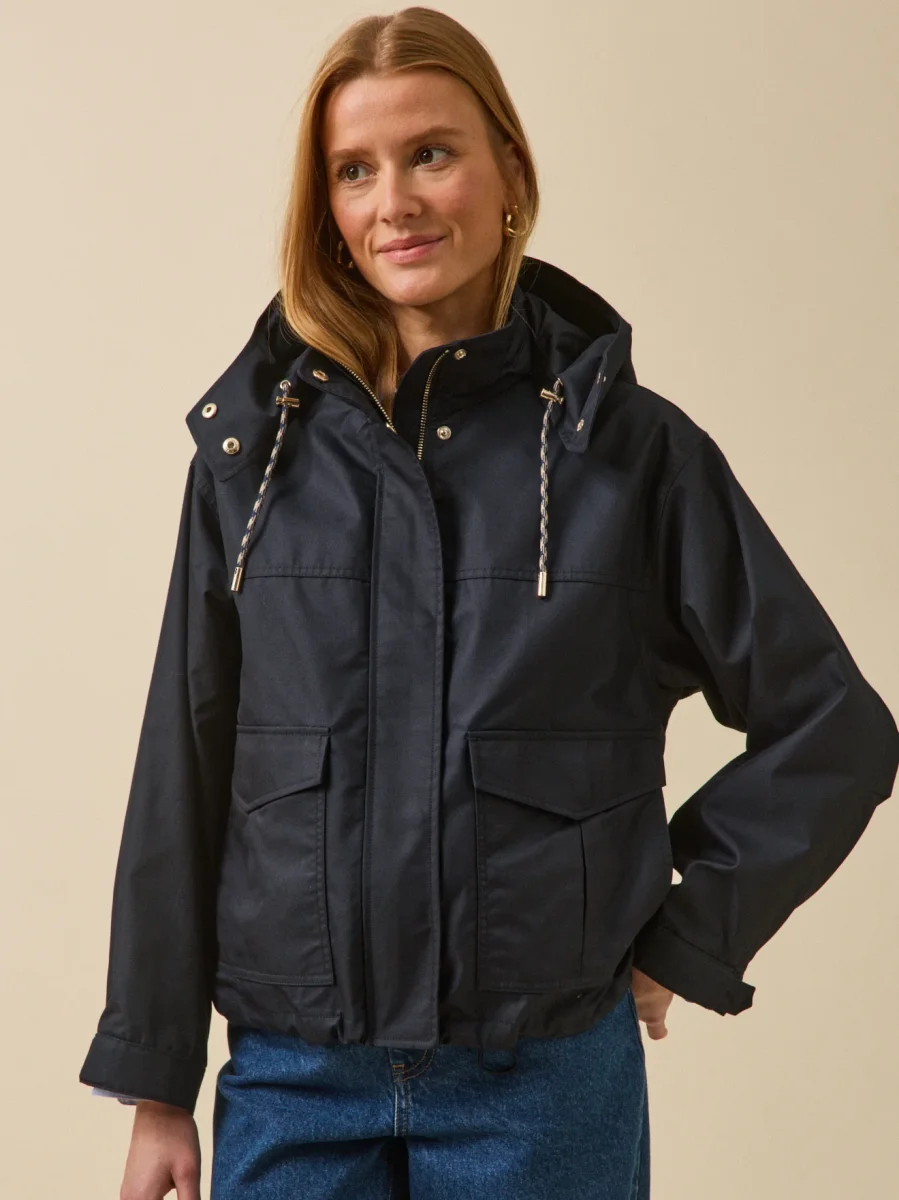 - Capuche resserrables par cordon et stoppeurs ; traitement déperlant ; long. dos 62 cm (en taille M)