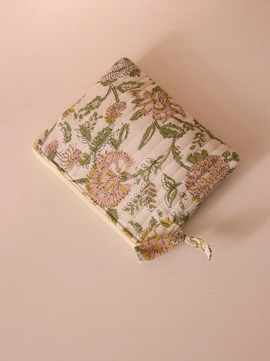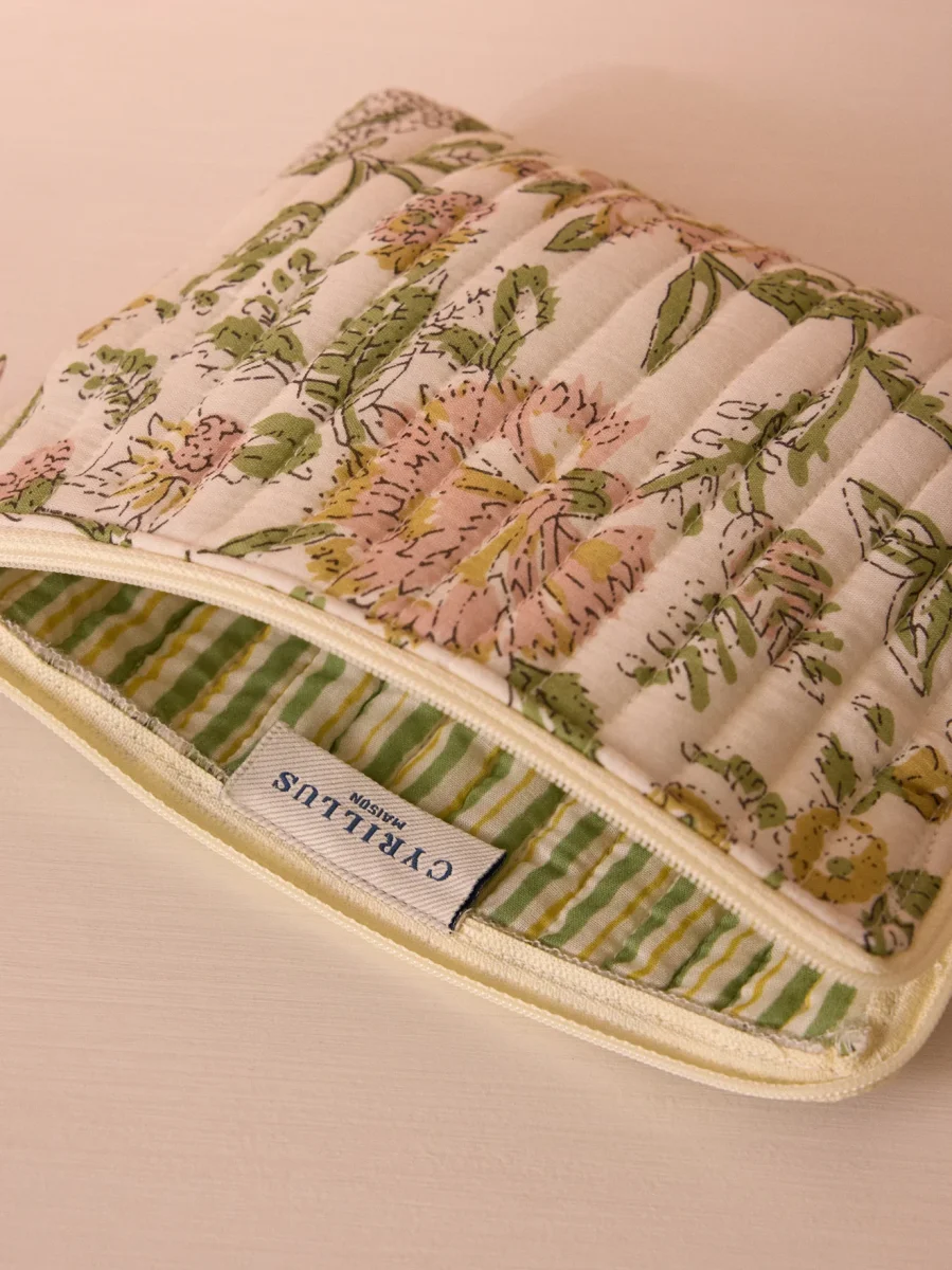 Petite trousse plate en coton matelassé au format idéal pour y ranger vos essentiels. Déclinée en 2 variantes fleuries : Sofia (vert/rose orangé) et Camélia (rose/bordeaux). Piqûres verticales pour un effet matelassé. Intérieur rayé assorti.