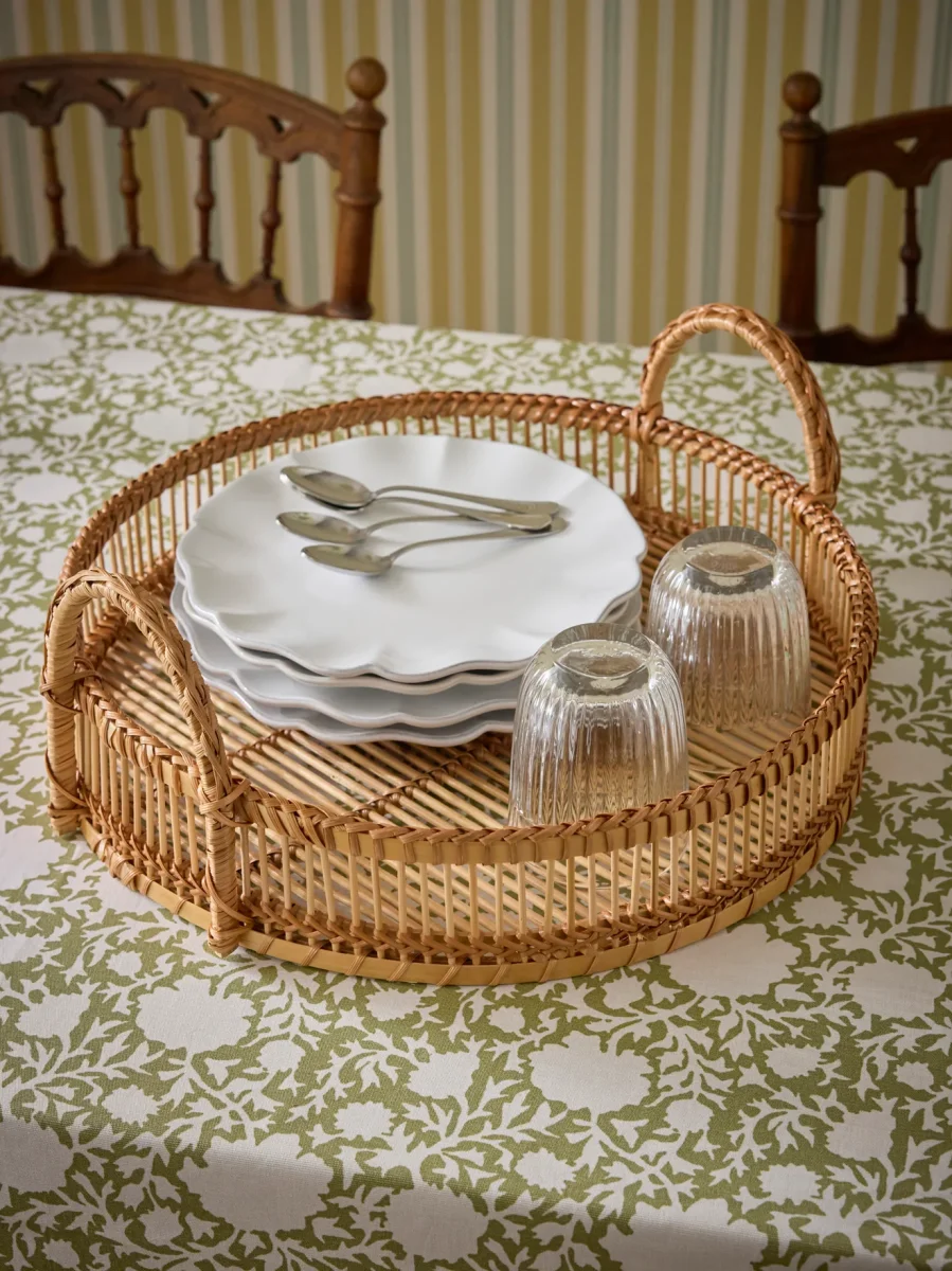 Grand plateau rond formé de tiges de bambou cerclées de rotin. Plateau de service à l’allure rétro chic, avec 2 anses pour faciliter le transport. Diamètre 38 cm. Hauteur 8 cm (sans les anses)