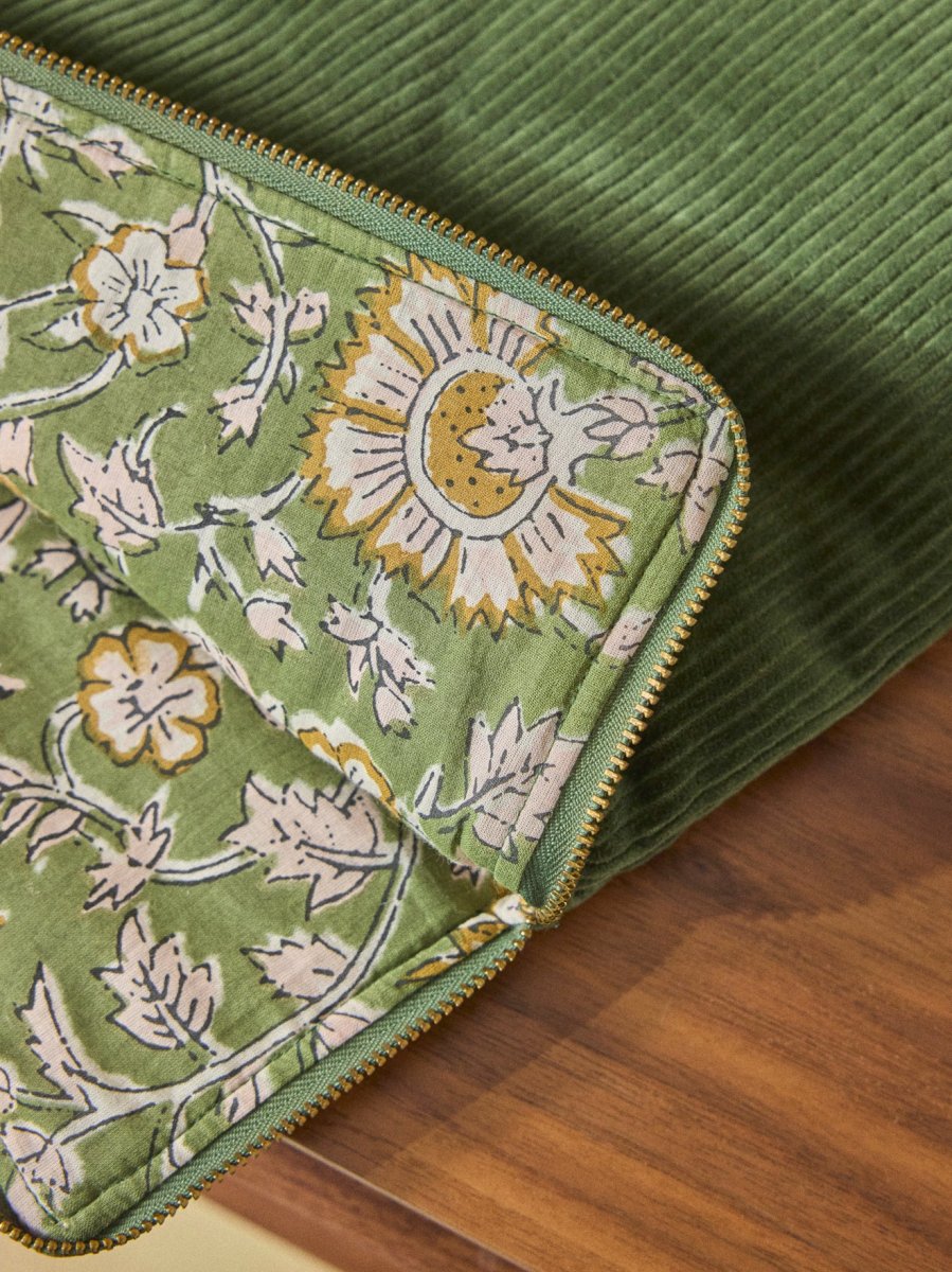 Housse matelassée en velours côtelé avec fermeture zippée et pompon assorti. Doublure fleurie en authentique tissu indien. Écrin doux et raffiné pour protéger un ordinateur ou transporter des documents.