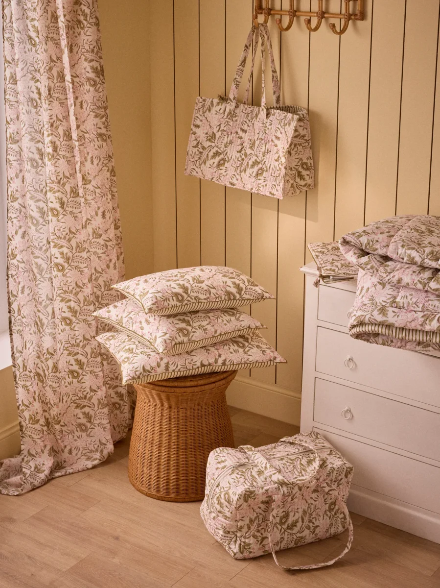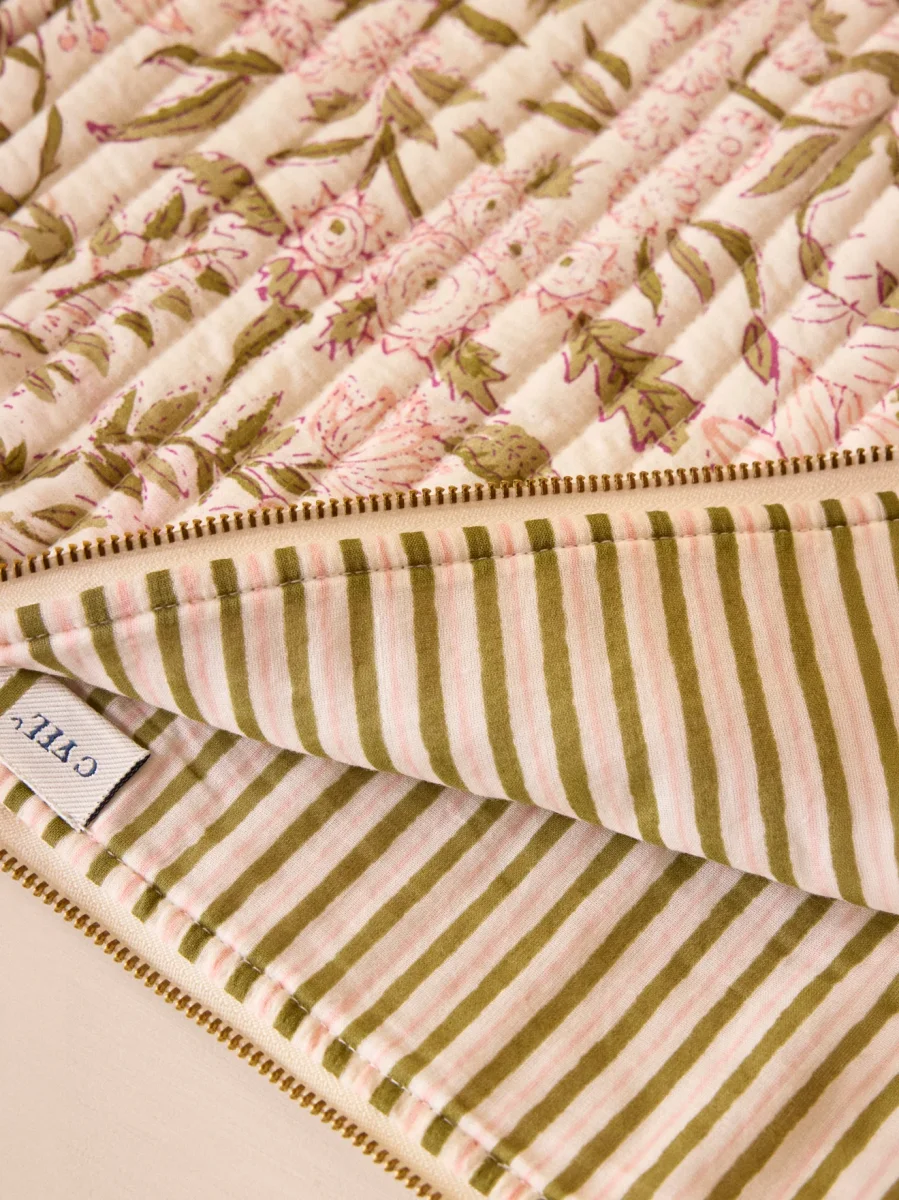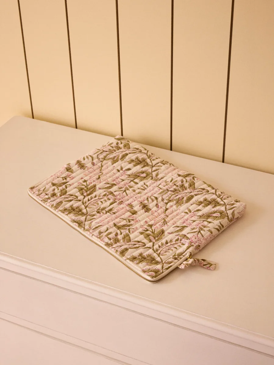 Housse matelassée en coton fleuri avec fermeture zippée et pompon assorti. Doublure rayée en authentique tissu indien. Écrin doux et raffiné pour protéger un ordinateur ou transporter des documents.