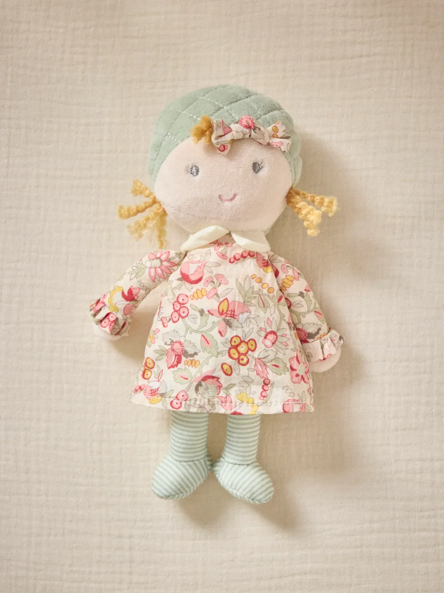Adorable petite poupée de chiffon en tissu et velours. La robe et le noeud sont confectionnés avec notre imprimé fleuri Mireille. Moelleuse, la poupée Juliette est facile à attraper, à câliner. Yeux et bouche brodés Poupée 22 cm environ Dès la naissance. Jouet conforme aux exigences des normes européennes.