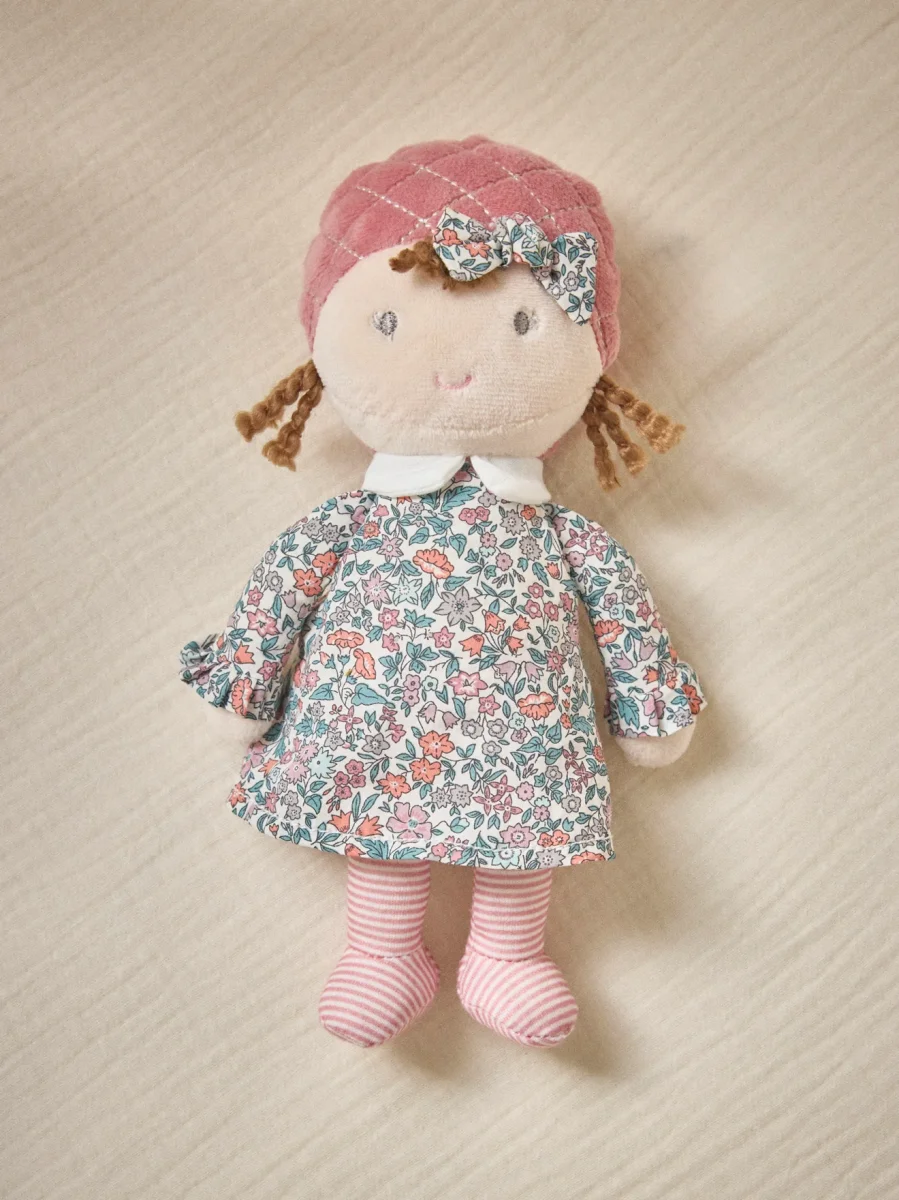 Adorable petite poupée de chiffon en tissu et velours. La robe et le noeud sont confectionnés en authentique tissu Liberty. Moelleuse, la poupée Louison est facile à attraper, à câliner. Yeux et bouche brodés Poupée 22 cm environ Dès la naissance. Jouet conforme aux exigences des normes européennes.