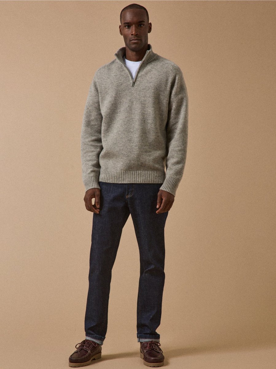 Il offre la chaleur et la douceur de la laine mérinos. Avec ses emmanchures marteau et son col montant zippé, le pull renouvelle les codes du style cool chic.