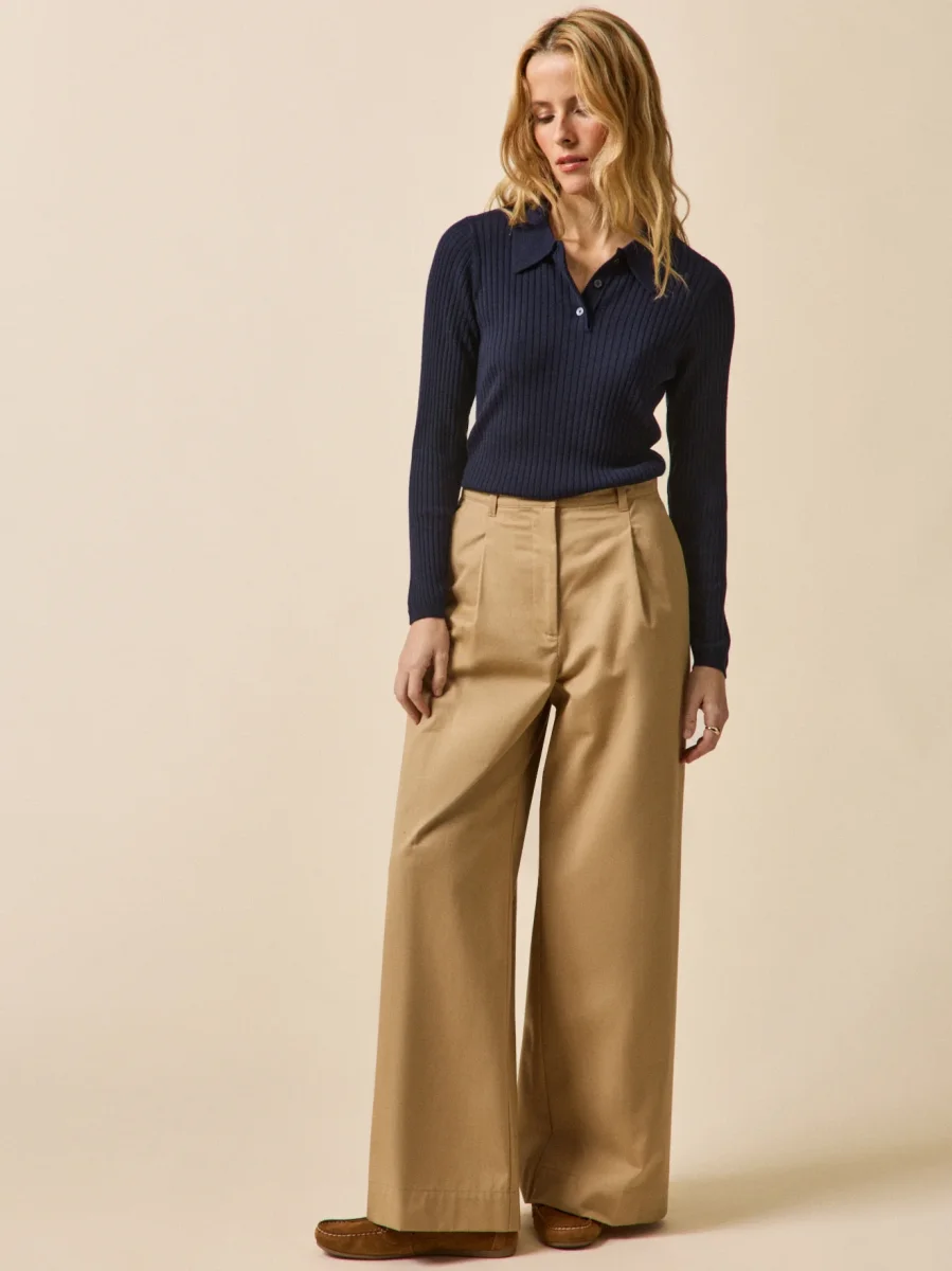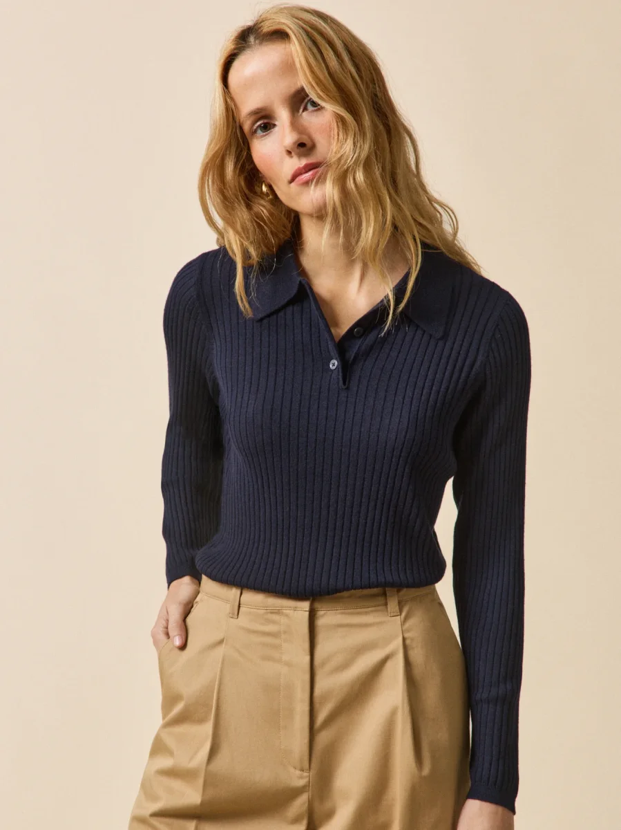 Côtes plates avec laine RWS* : sous un col polo, le pull révèle une élégance faussement classique. Une pièce maîtresse à l’allure facile, qui s’adapte à chaque style avec un raffinement naturel.
