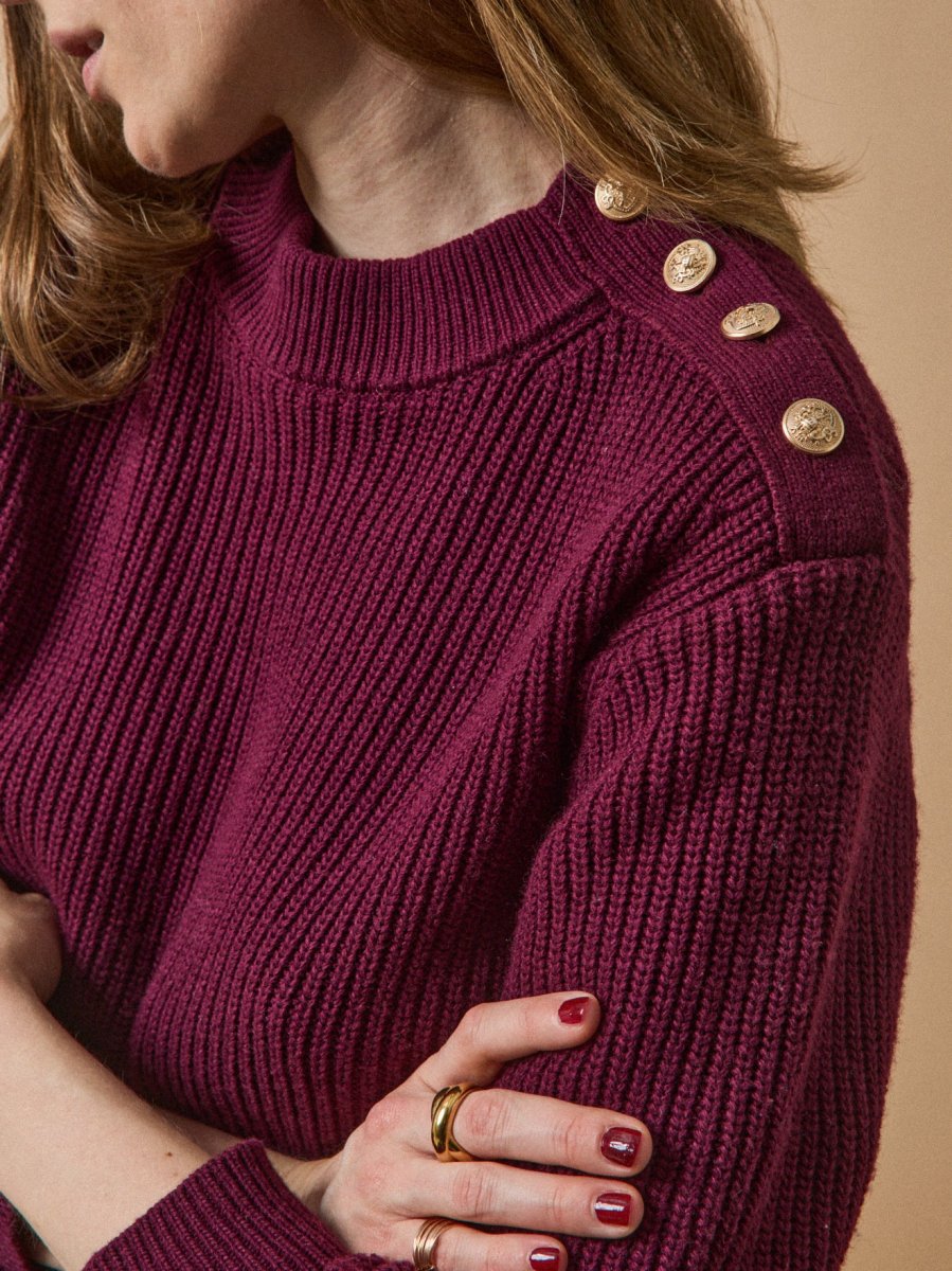 Rouge profond sur maille anglaise bien chaude avec laine RWS*, gros boutons dorés et manches longues descendues. Faussement classique, le pull fait l’allure facile car il s’adapte à tous les styles. Col rond légèrement montant, patte boutonnée sur 1 épaule Finitions par bord-côtes ; long. 53 cm (en taille S)