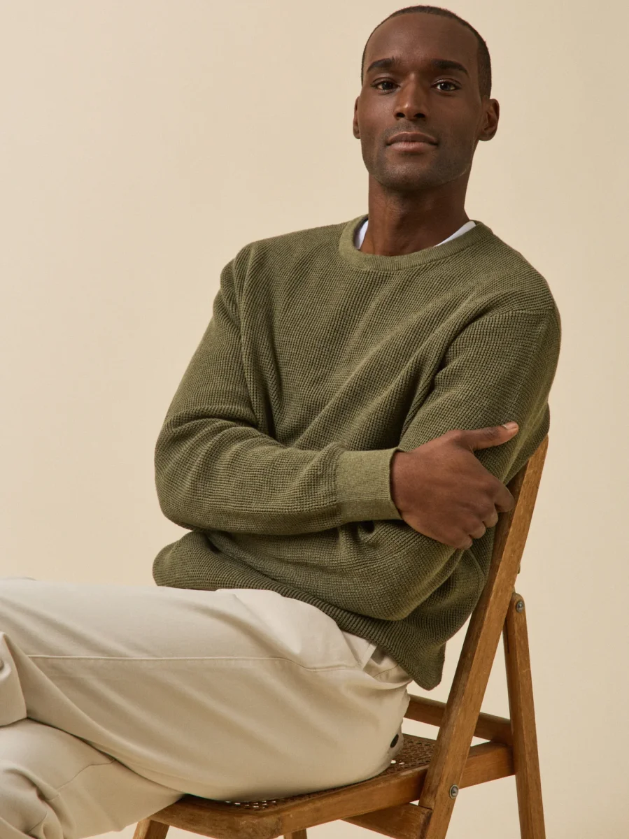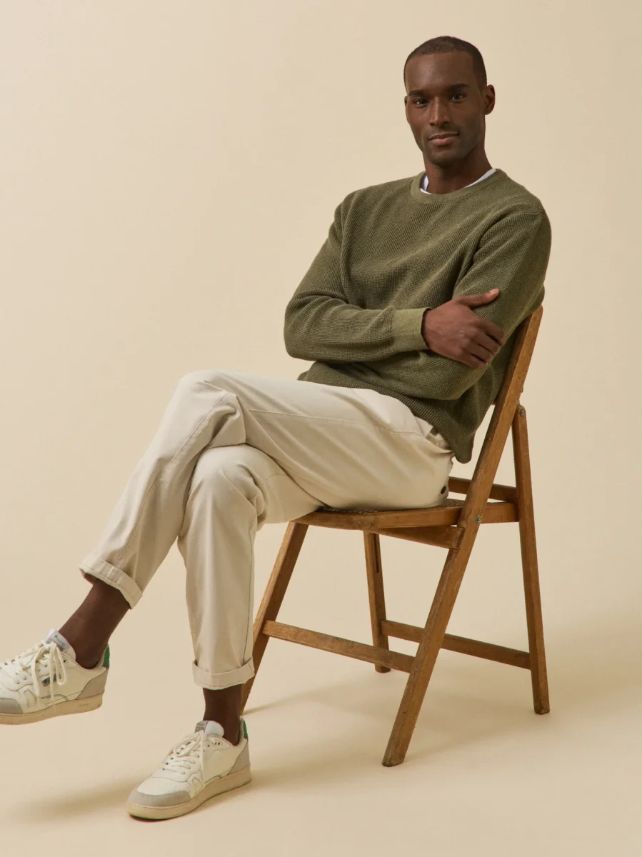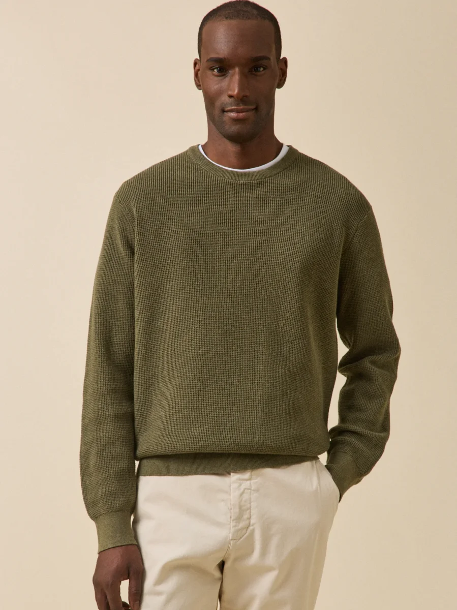 Classe sur un jean ou un chino, cool sur un bermuda, le pull ras-de-cou s’offre un coloris dans l’air du temps et une belle maille gaufrée en coton léger. Une pièce idéale pour la mi-saison.