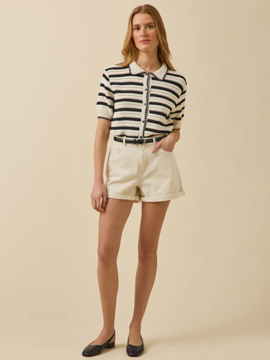 Tricoté en coton biologique certifié, il fusionne l’élégance intemporelle du style marin et la texture reliefée du crochet. Pièce forte de la saison, le pull col polo signe un look graphique, à la fois décontracté et sophistiqué.