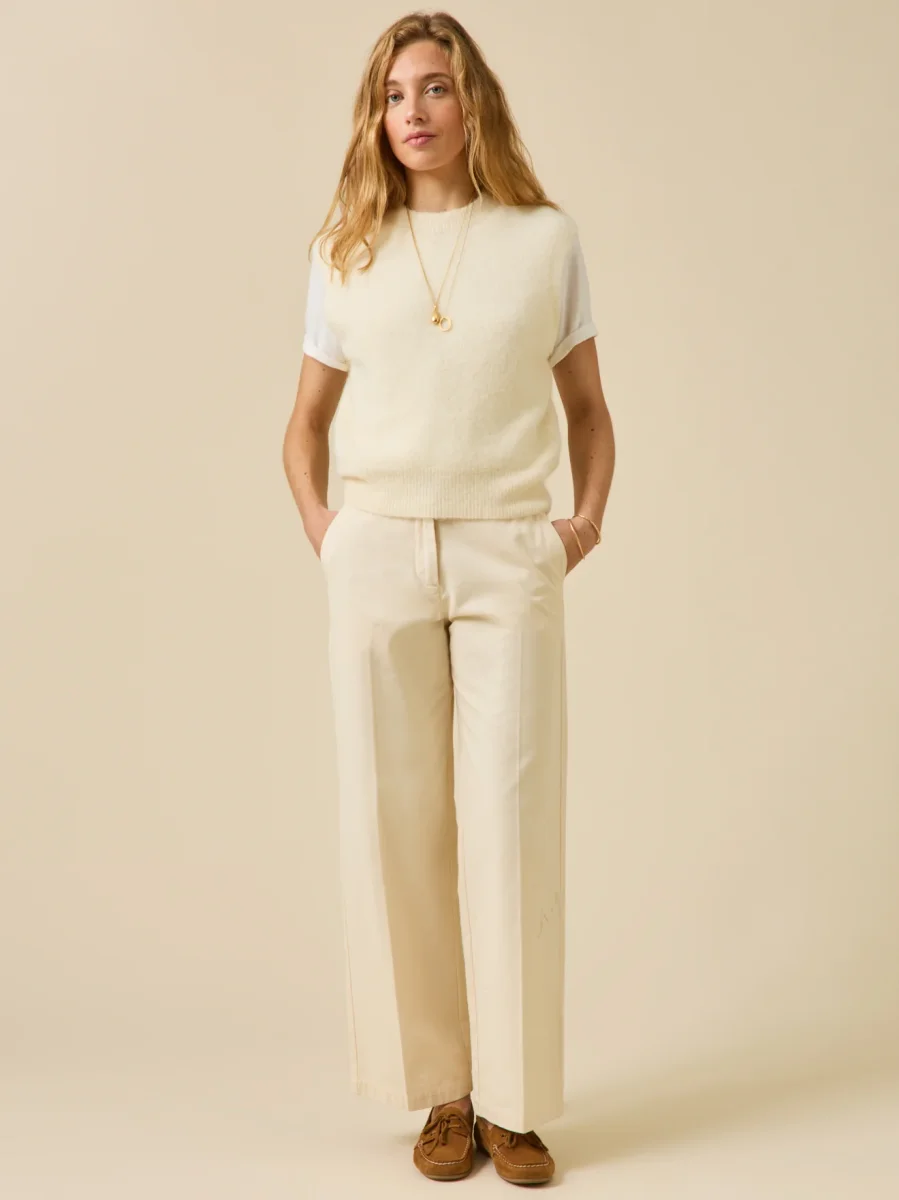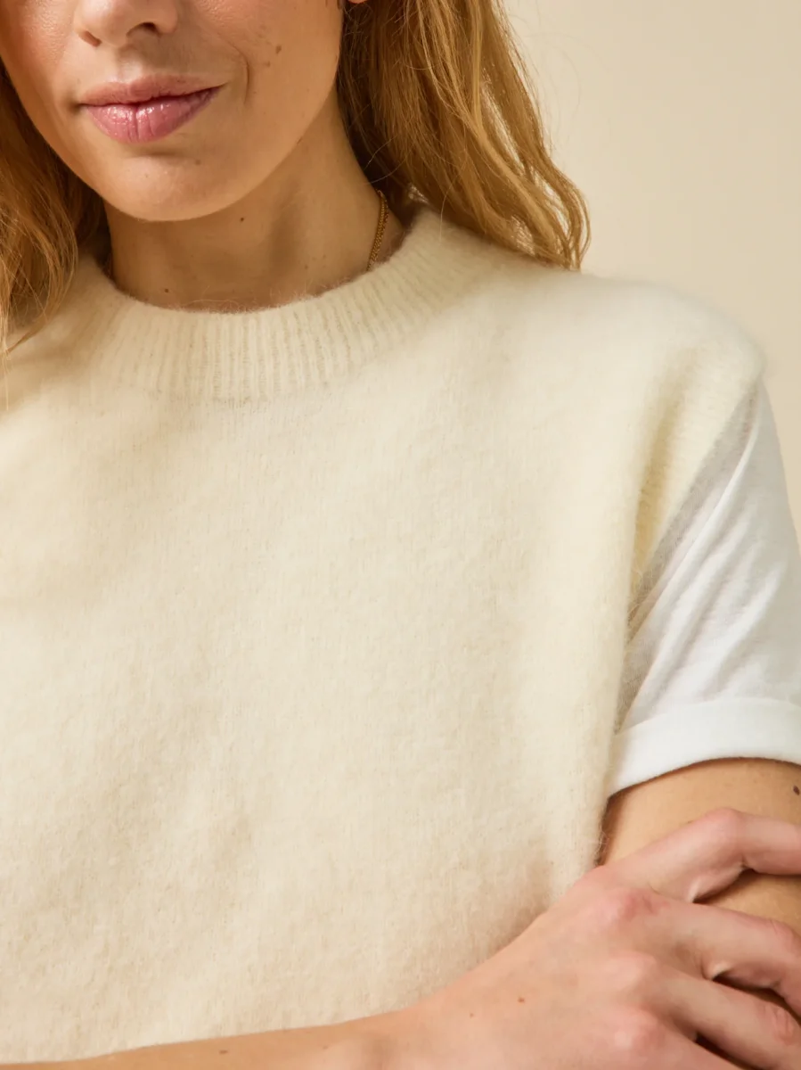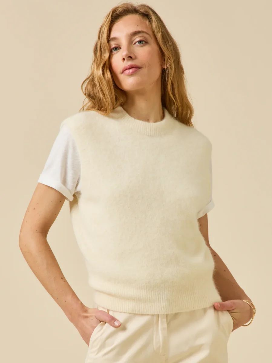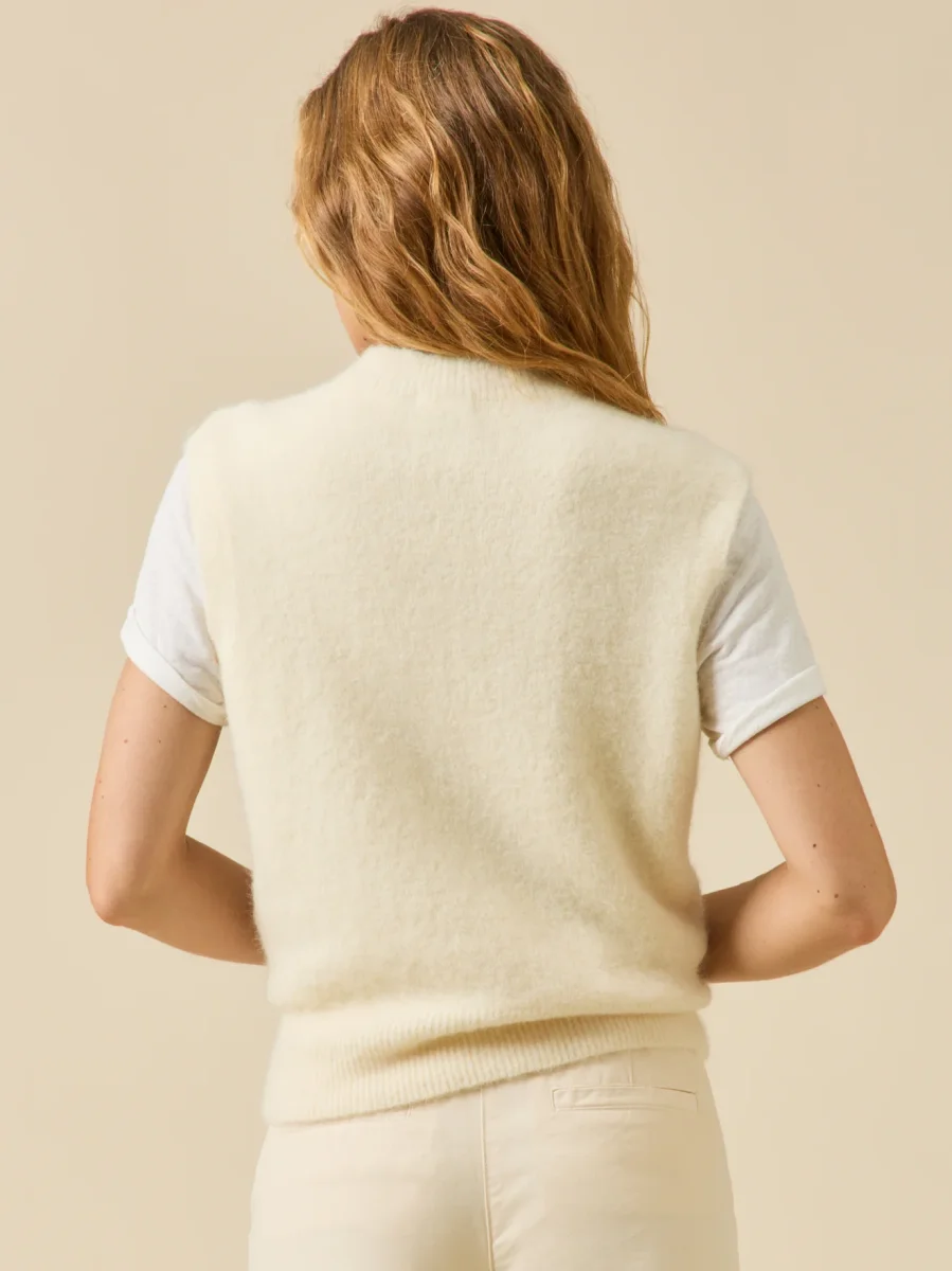 Ultra doux et raffiné, tricoté dans fil italien de qualité exceptionnelle et remarquable par son design inédit sans coutures. Pour incarner un style féminin moderne, il se superpose à des chemises ou des blouses aux manches généreuses. Confection Italie.