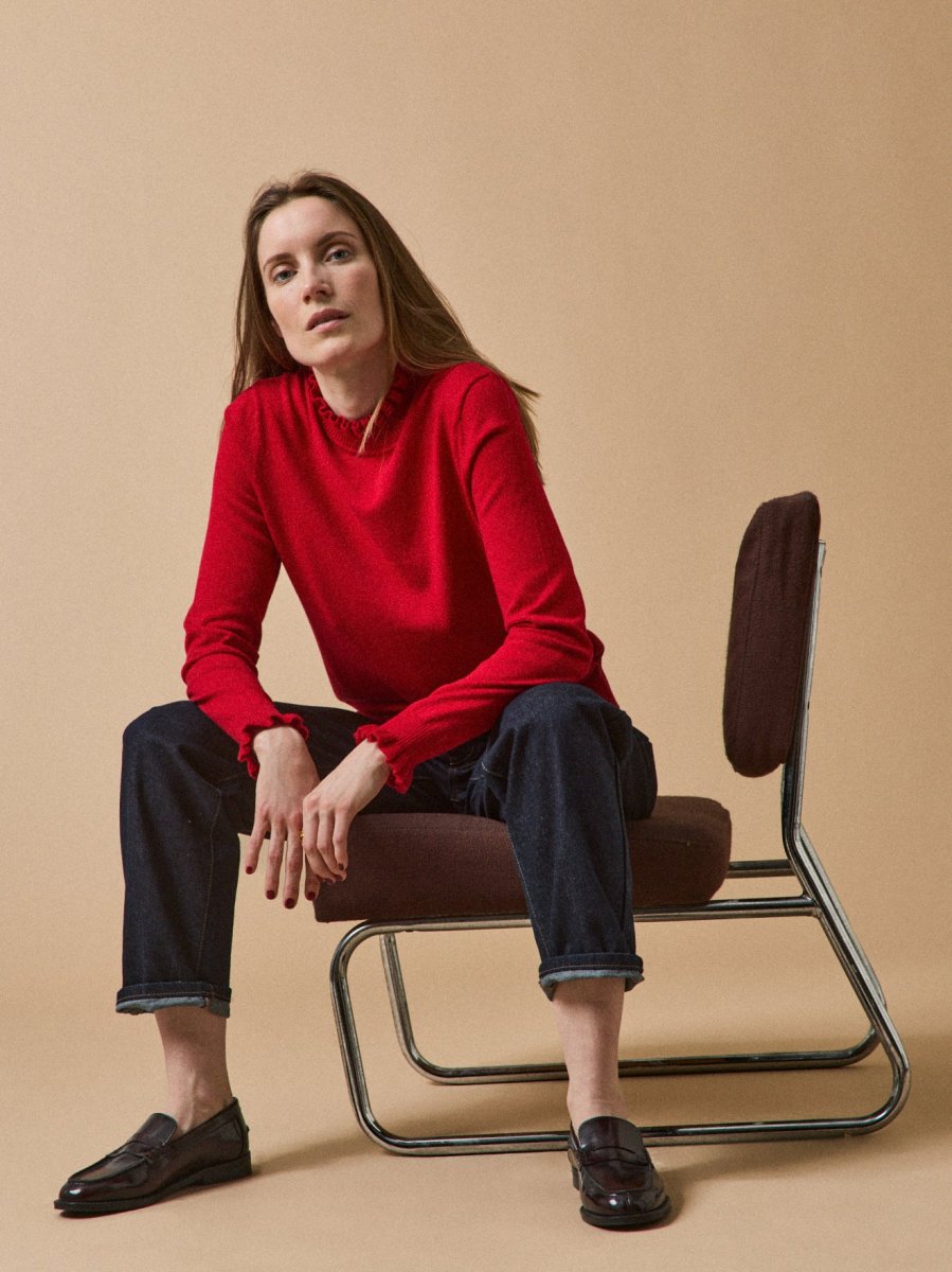 Fil naturel en coton biologique et laine certifiée RWS*. Le pull s’offre la fantaisie de finitions volantées et un volume actuel mis en valeur par de larges bord-côtes.