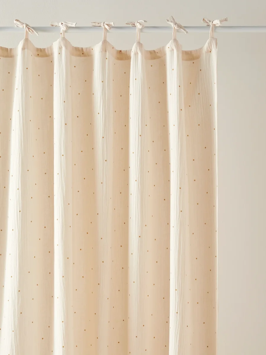 Rideau à l’aspect gaufré confectionné en gaze de coton et maintenu par de petites nouettes.