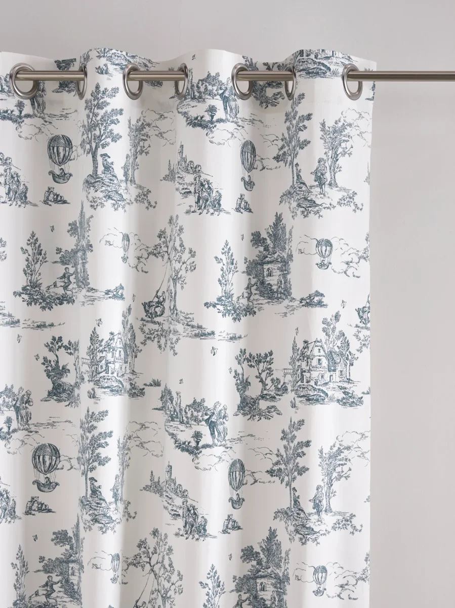 Nous avons choisi de nous inspirer de l’esprit toile de Jouy pour réaliser ce rideau à oeillets en coton épais. Un style quasi authentique au charme chic et intemporel.