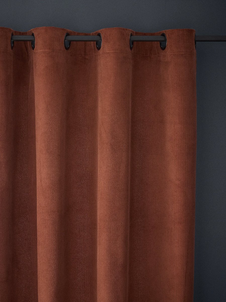 Rideau en velours côtelé pour une atmosphère élégante, chaleureuse et contemporaine. Les oeillets noirs, chics et discrets, accentuent cette touche de modernité.