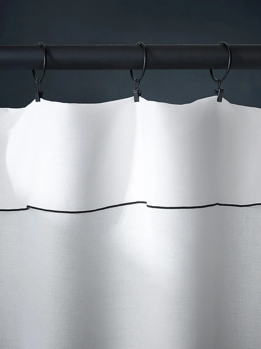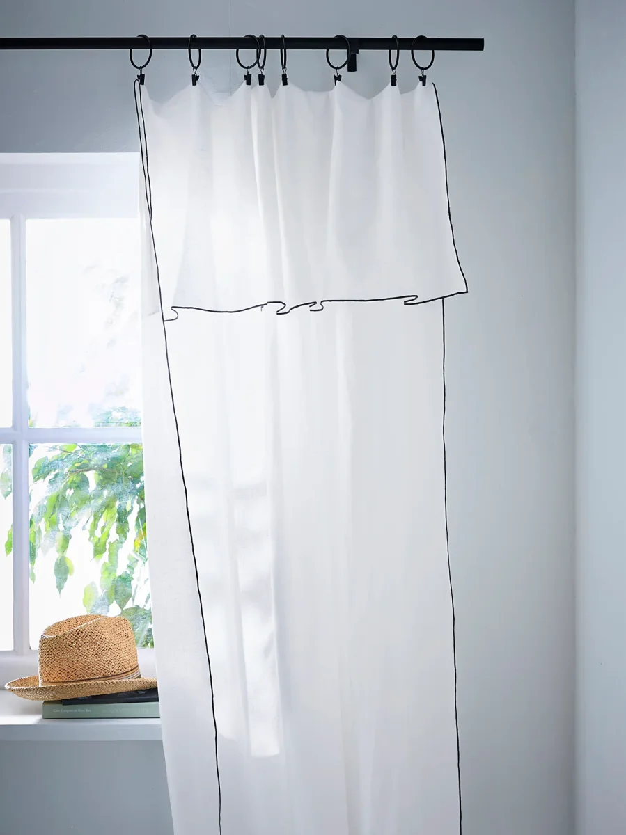 Plus besoin d’ourlet ni de crochets : ce pan de rideau en lin lavé s’attache à la hauteur souhaitée à l’aide d’anneaux à pince (vendus séparément). Son format original et sa finition élégante en point de bourdon noir modernisent le traditionnel rideau en lin. Fabriqué au Portugal.