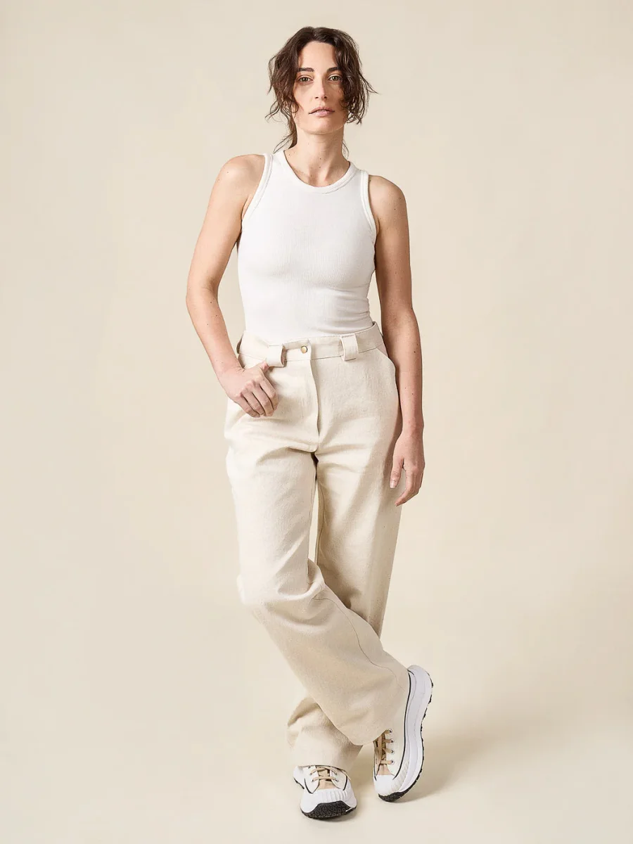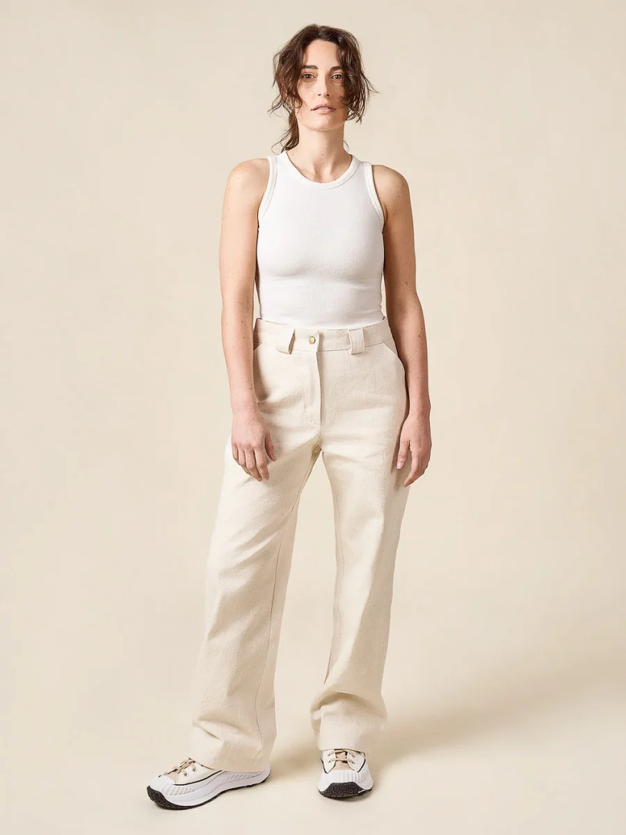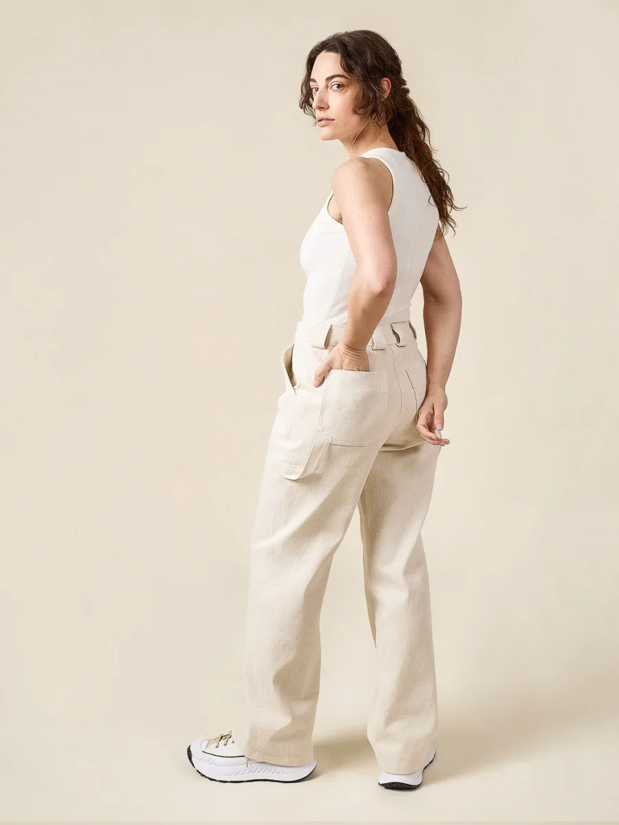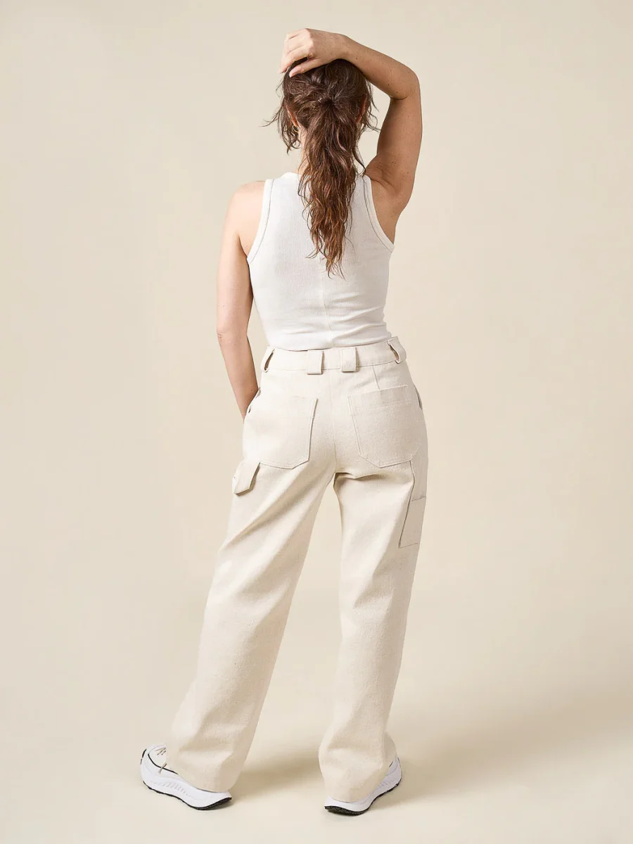 One pants pattern, two looks! The Rika Pants are a timeless and versatile design that can feel like tailored trousers or utilitarian workwear depending on your choice of details. Featuring a high rise sitting just below the natural waist, a three-piece waistband, angled front pockets, a fly front zipper, and a straight leg, Rika has you covered coming and going.