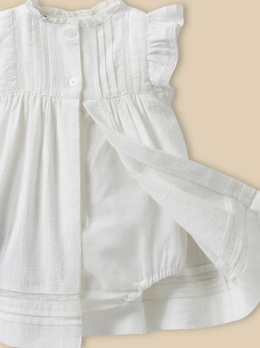 Une robe travaillée avec délicatesse, parfaite pour un baptême ou une cérémonie. Une pièce d’exception pour les grandes occasions. Livrée avec sa barboteuse intégrée.