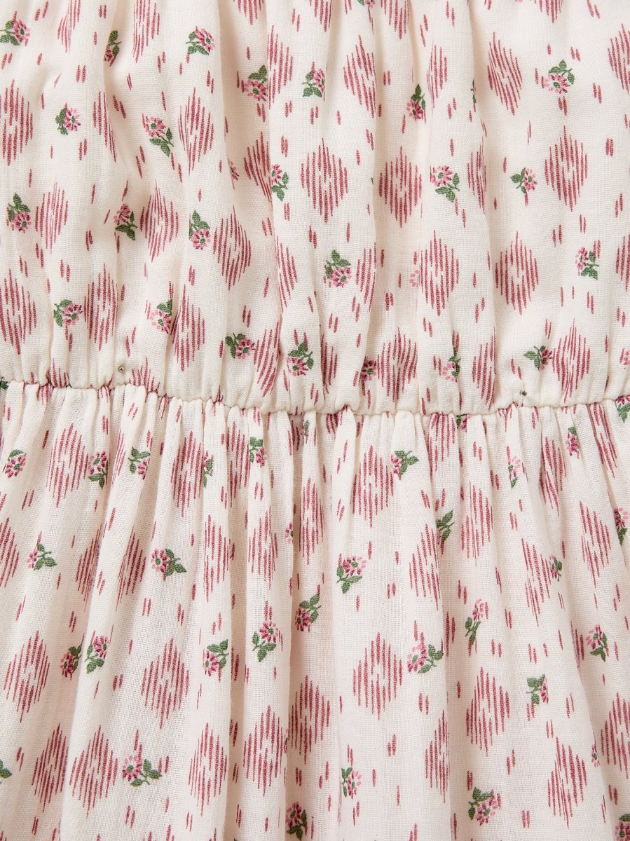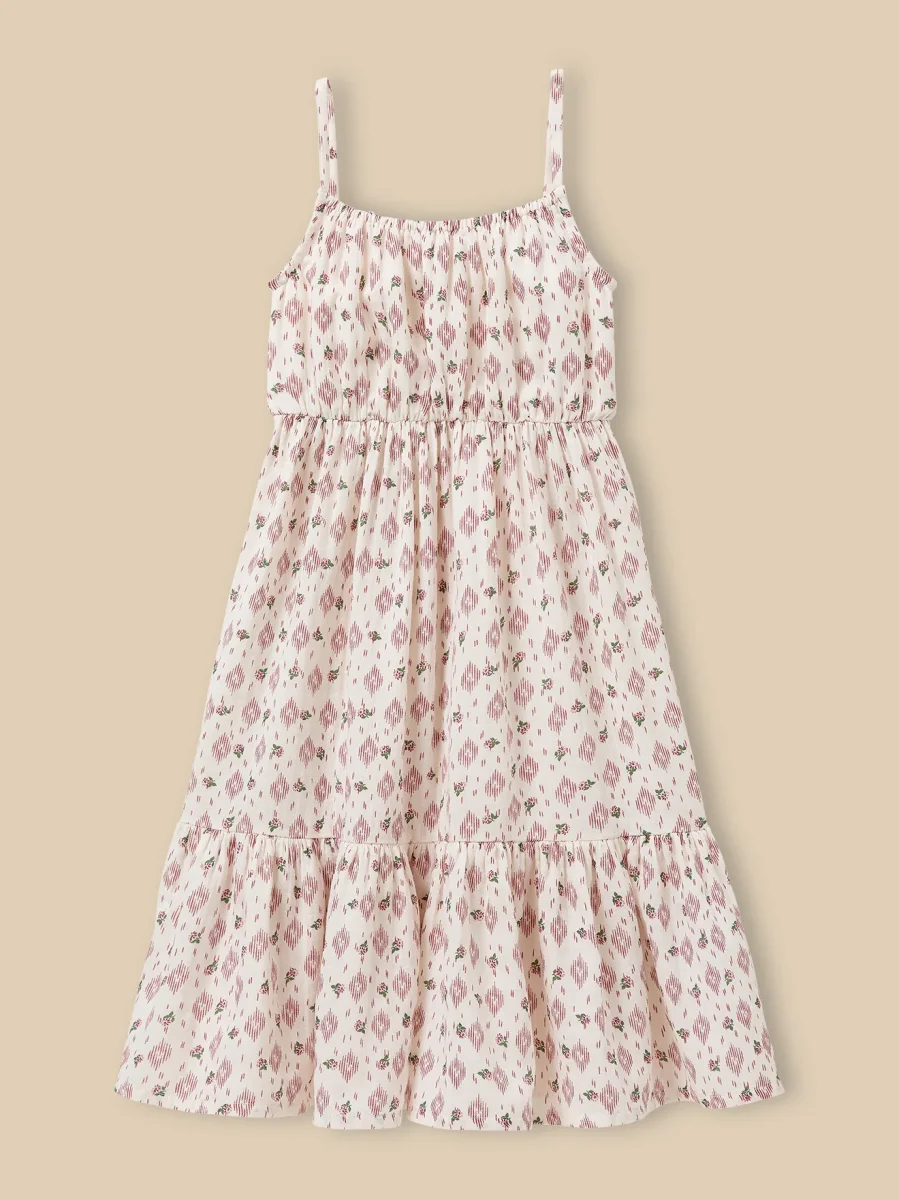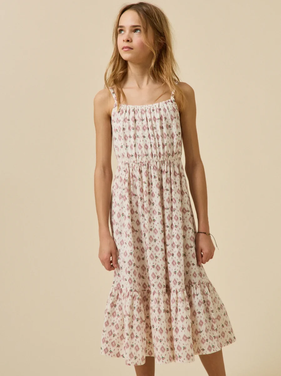 Robe longue à fines bretelles, encolure élastiquée, large bande smockée au dos et large volant à la base. Le style bain de soleil confectionné avec notre imprimé Carolina, aussi frais qu’ensoleillé.
