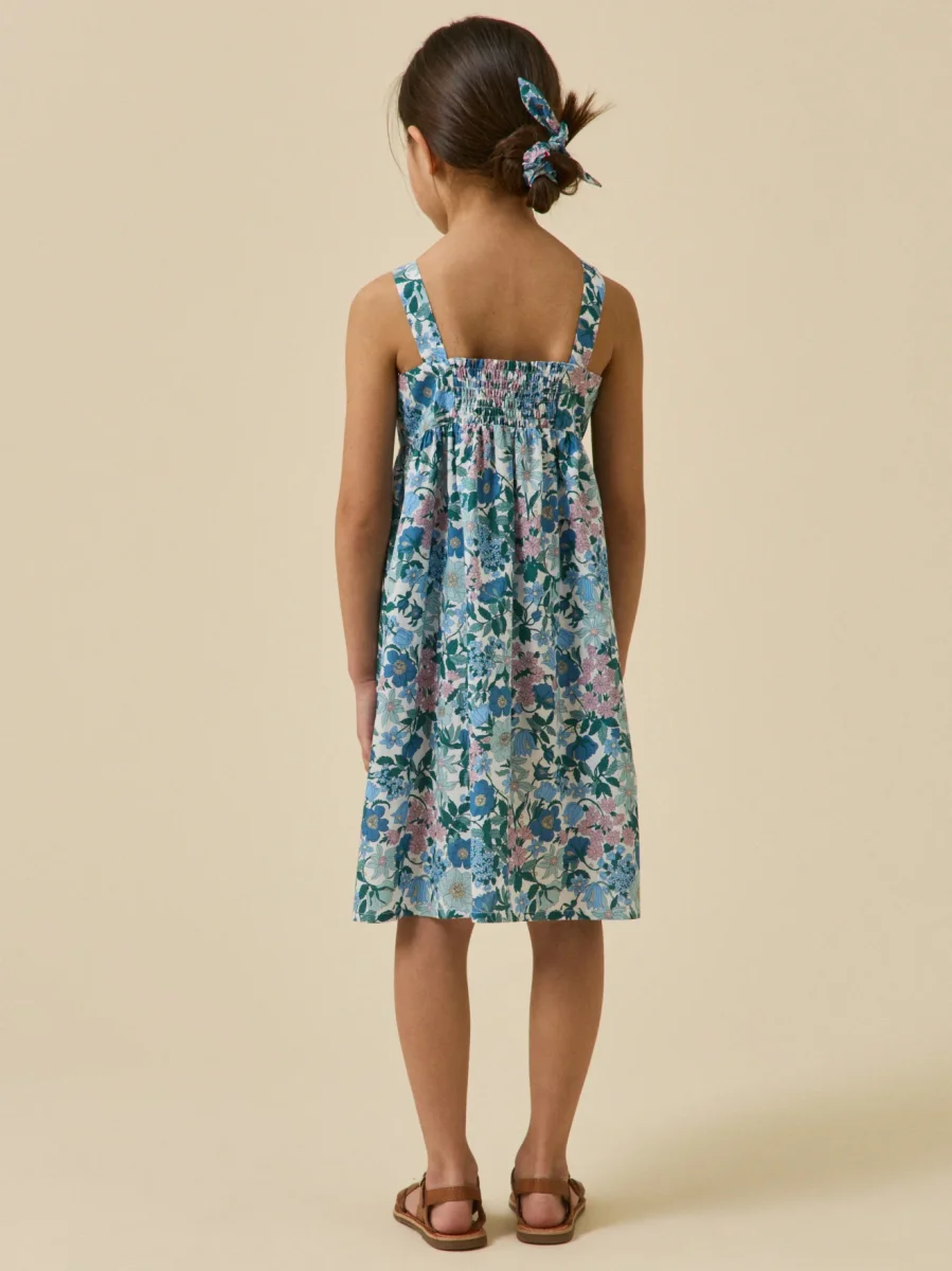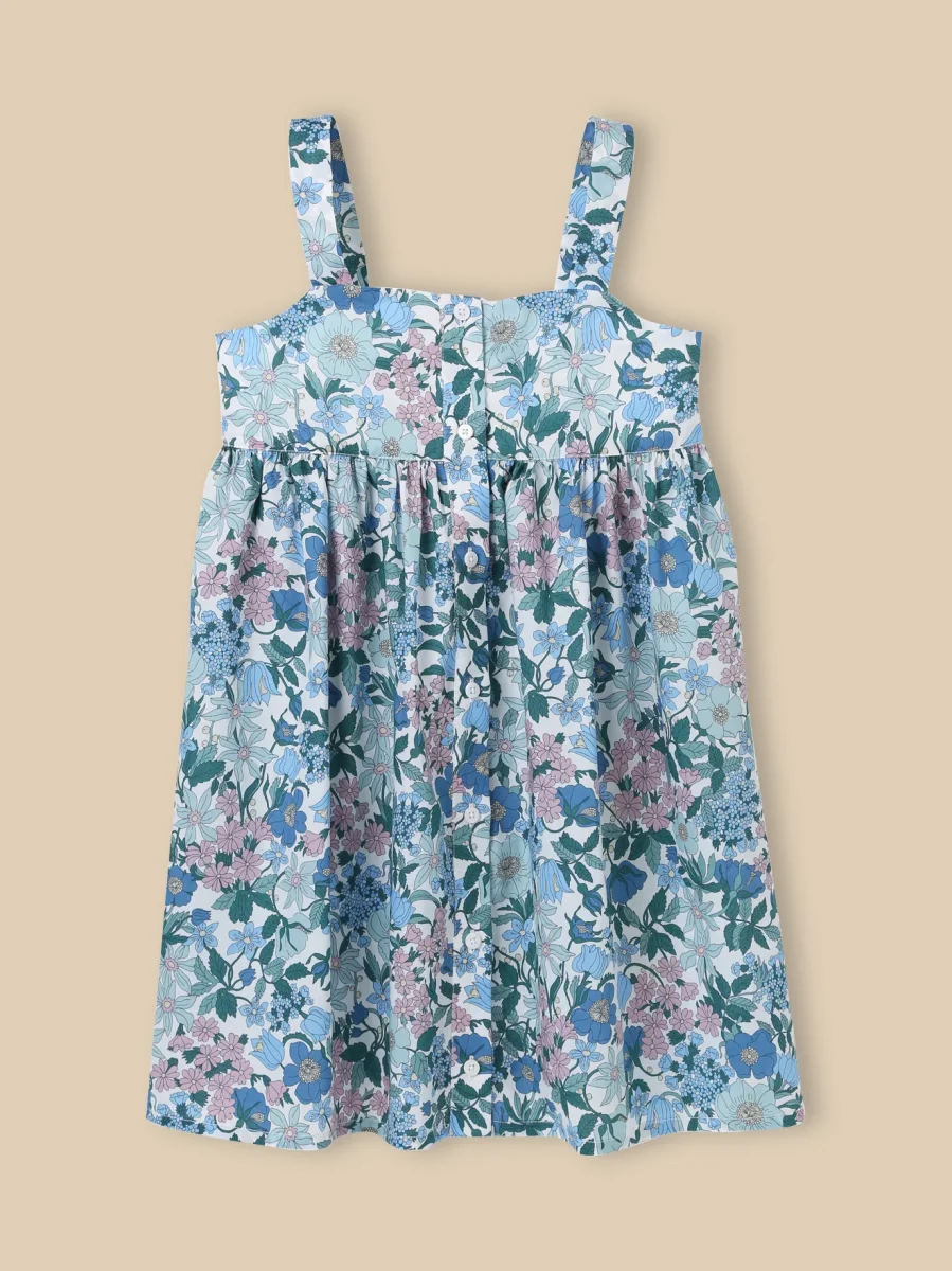 Robe en tissu Liberty Clara Bell aux nuances de bleu, dotée d’une encolure carrée et d’un dos smocké. Une pièce raffinée et légère, idéale pour l’été. Robe à bretelles.