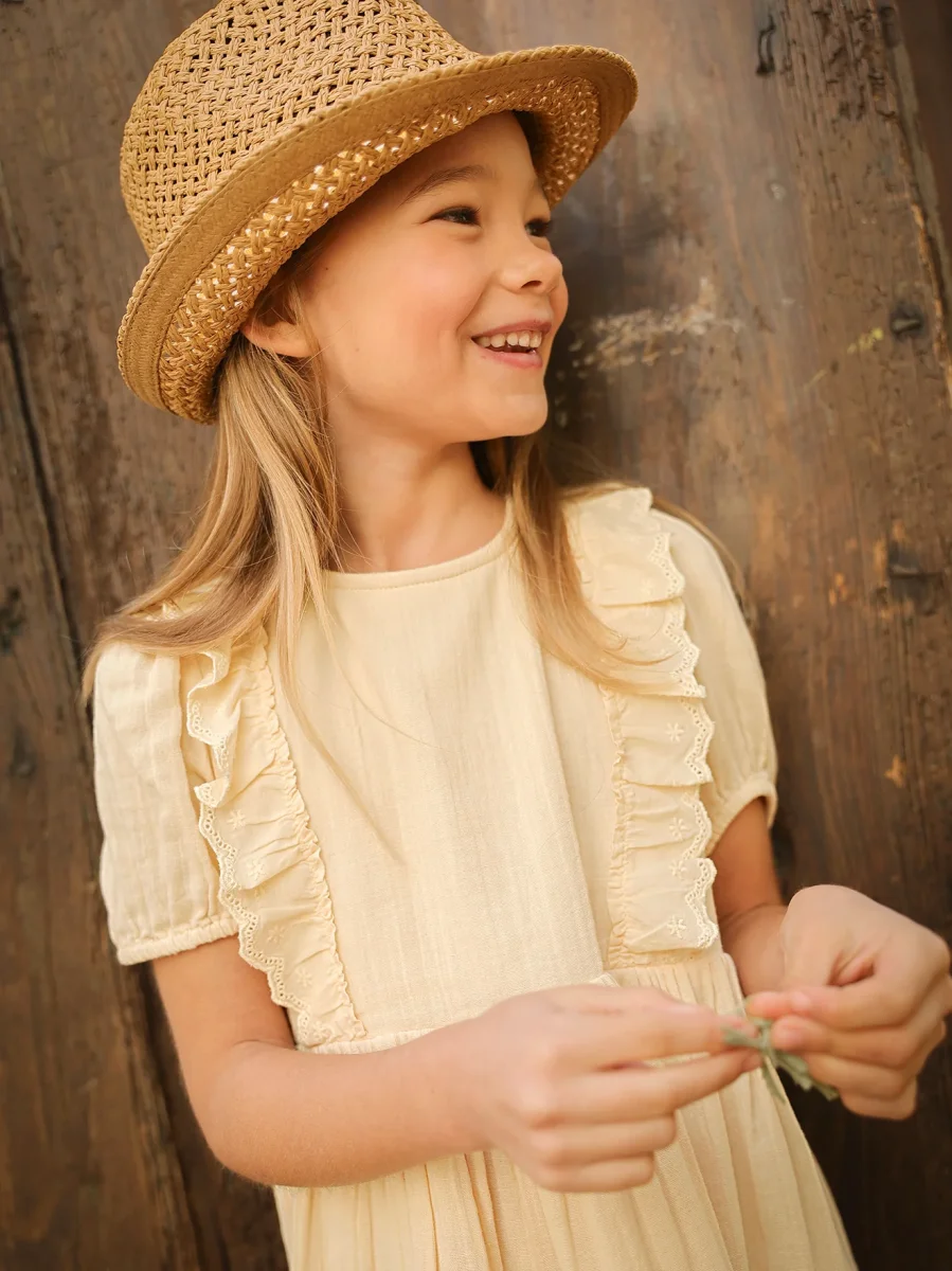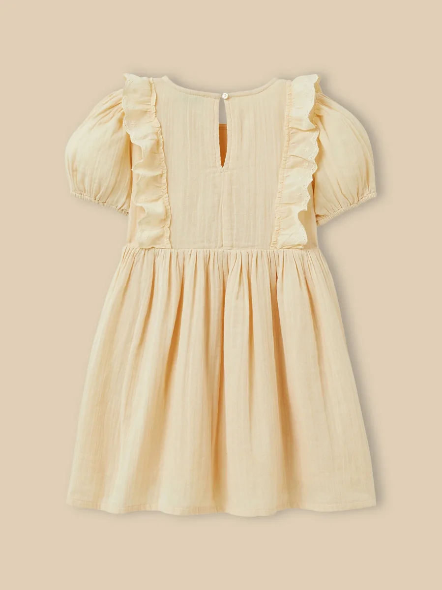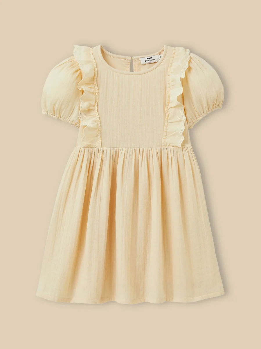 À la fois chic et bohème, la robe en gaze de coton animée de froufrous en dentelle pour la touche de fantaisie.