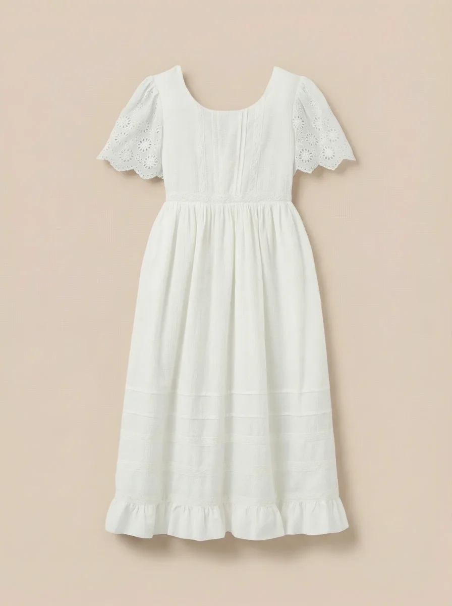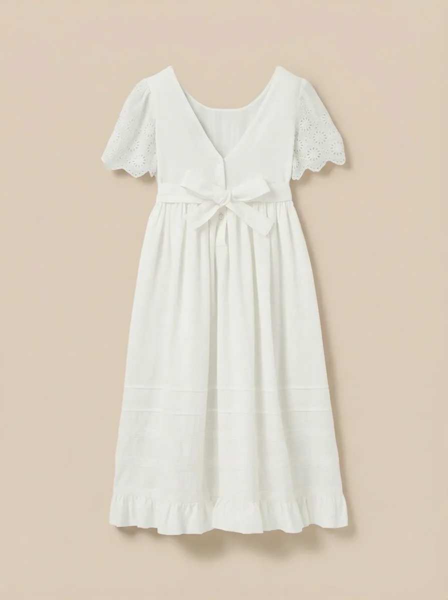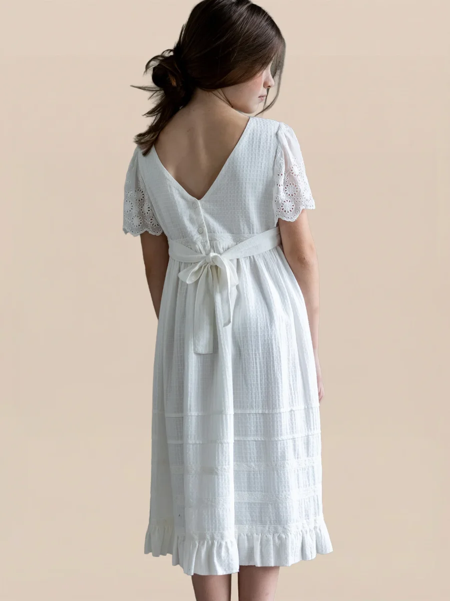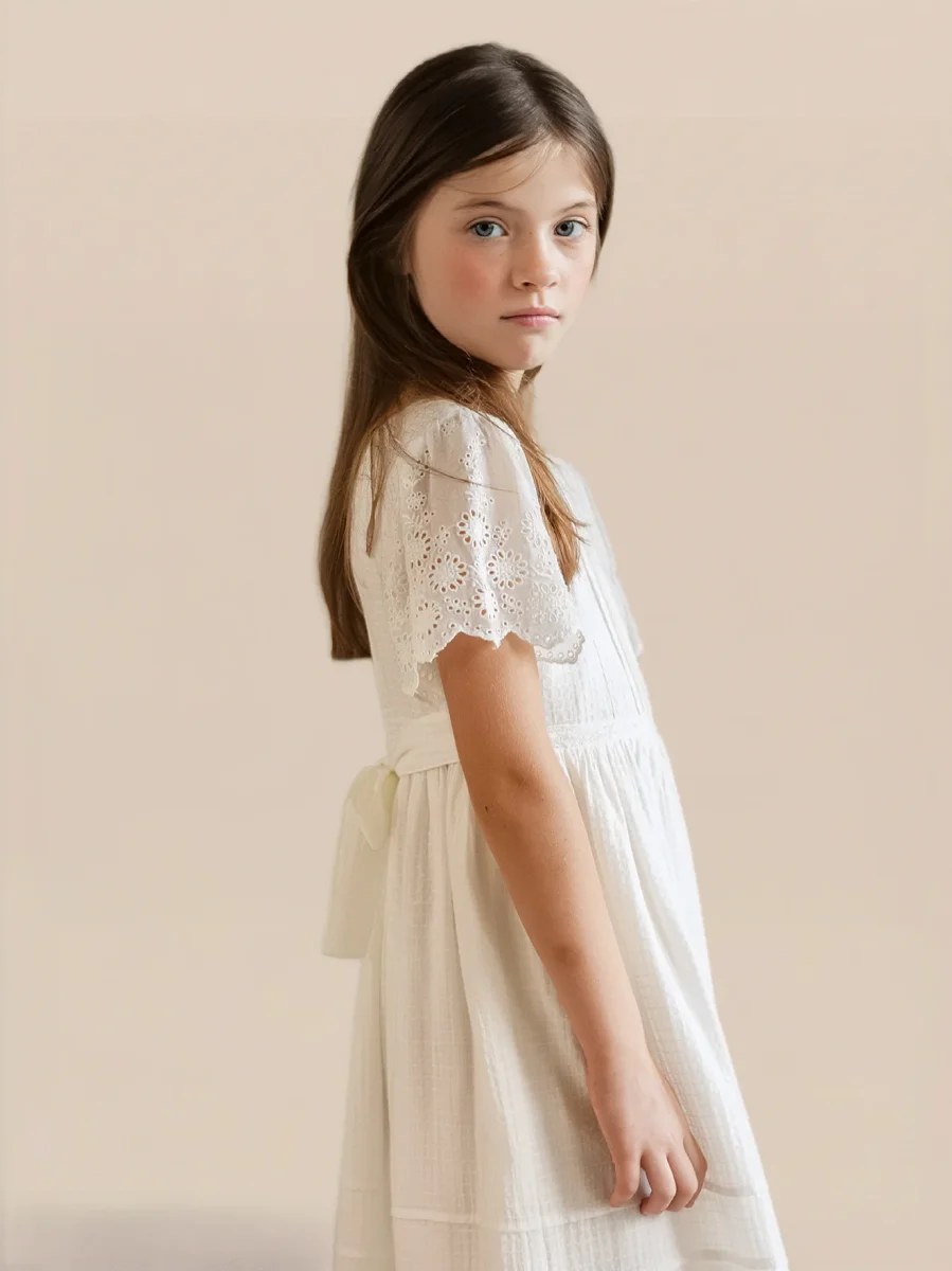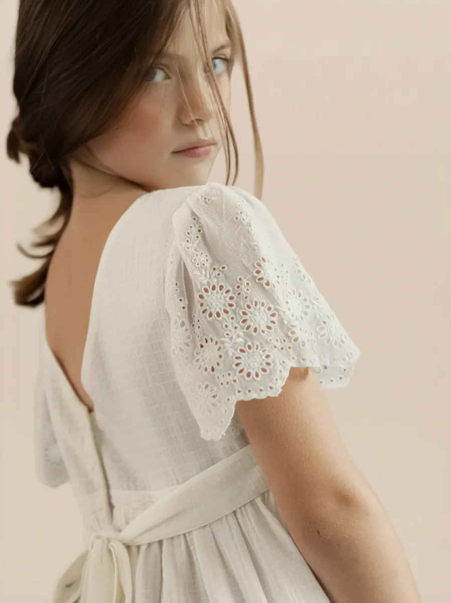 Tissu reliefé, manches courtes en voile avec broderie anglaise, galons de dentelle ici et là, plis plats et volant à la base. Robe de cérémonie aux détails subtils et à la finition soignée.