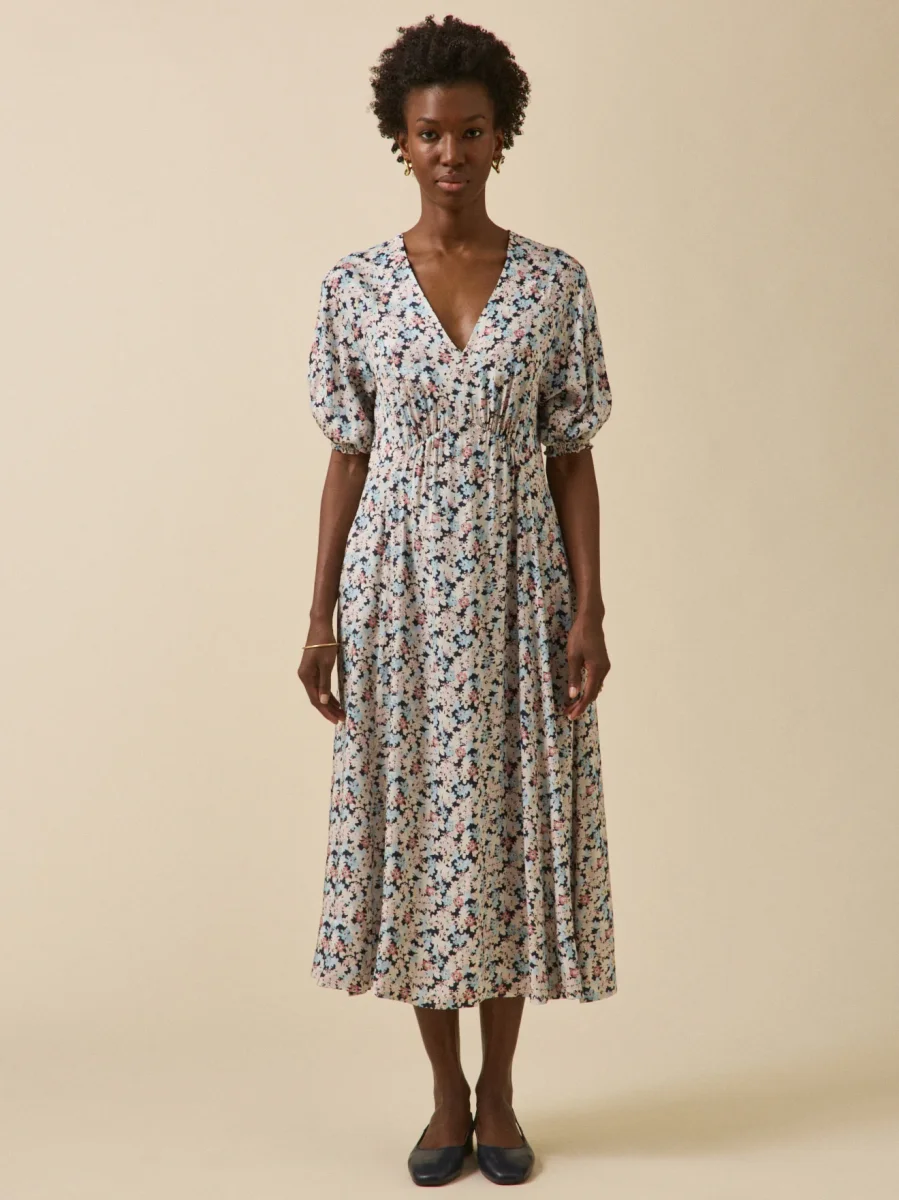 - Col V devant, fermeture zippée invisible dos ; manches courtes, bas smockés