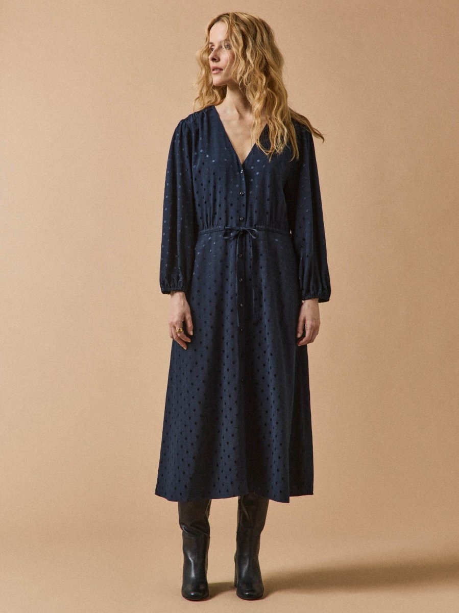 Jacquard pois reliefé légèrement irisé, matière fluide et douce, volume et longueur mode… En adoptant avec subtilité les codes de la féminité, la robe s’envisage au quotidien comme pour les moments festifs.