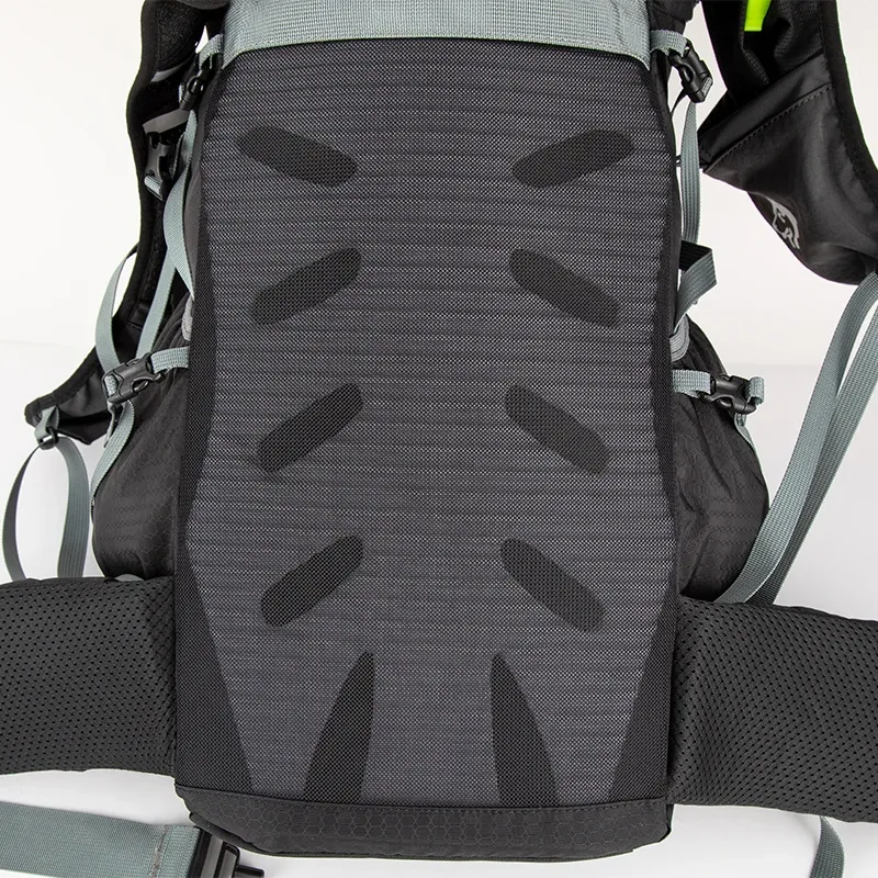 Construction en nylon ripstop 210D avec enduction PU et traitement déperlant pour résister aux aversions courtes et aux frottements. Dos en mousse canalisée recouverte de maille 3D : ventilation efficace et évacuation de la transpiration. Bretelles ergonomiques réglables, sangle sternale ajustable avec sifflet d’urgence visible sur photo, ceinture matelassée avec poches zippées.